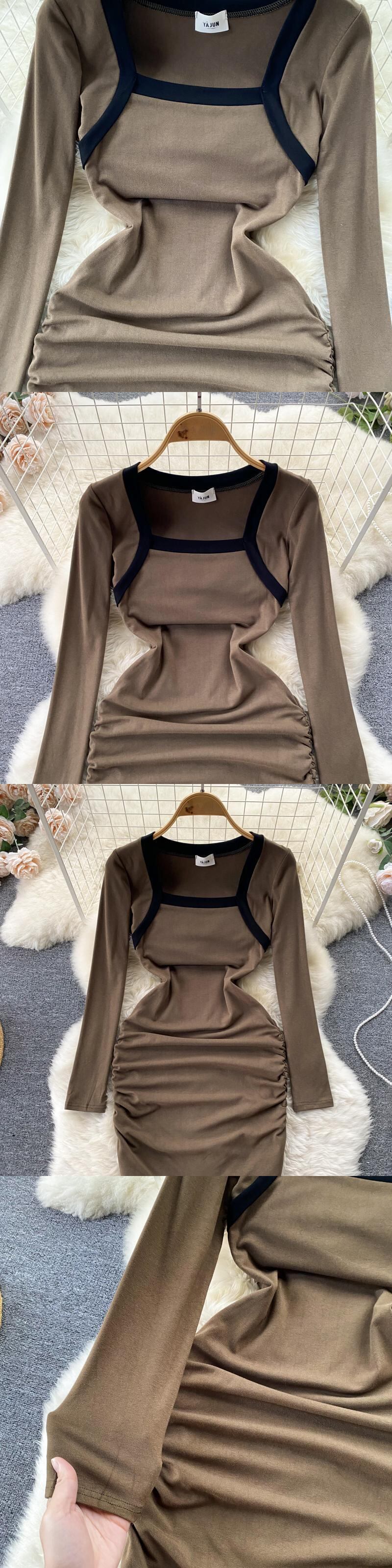 2022年秋の新デザインセンスコントラストカラーステッチスクエアカラースリムショートセクションスキームプリーツヒップドレス女性のトレンド オータム 秋物 スクウェア lyxaj78800220163