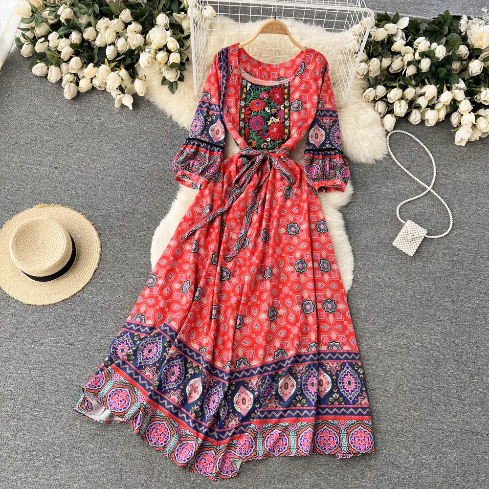 Spring dress retro style waist slim temperament long-sleeved skirt fairy super fairy est print over-the-knee long skirt ロング レトロ スプリング 春物 スカート スリム lyxaj1305938339
