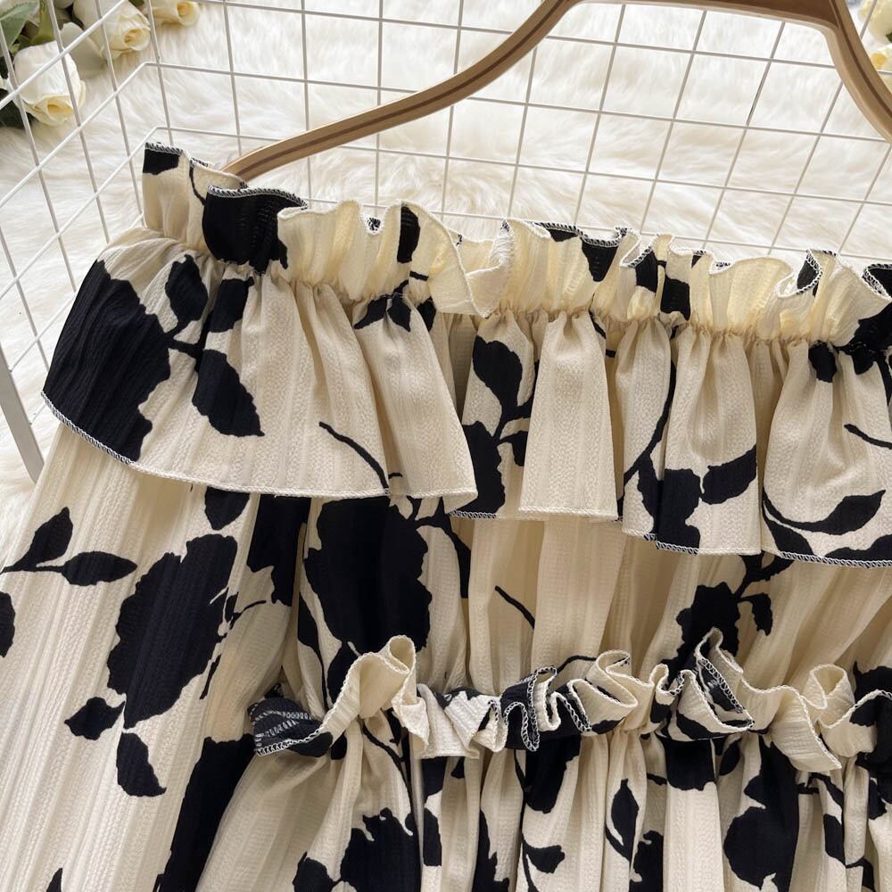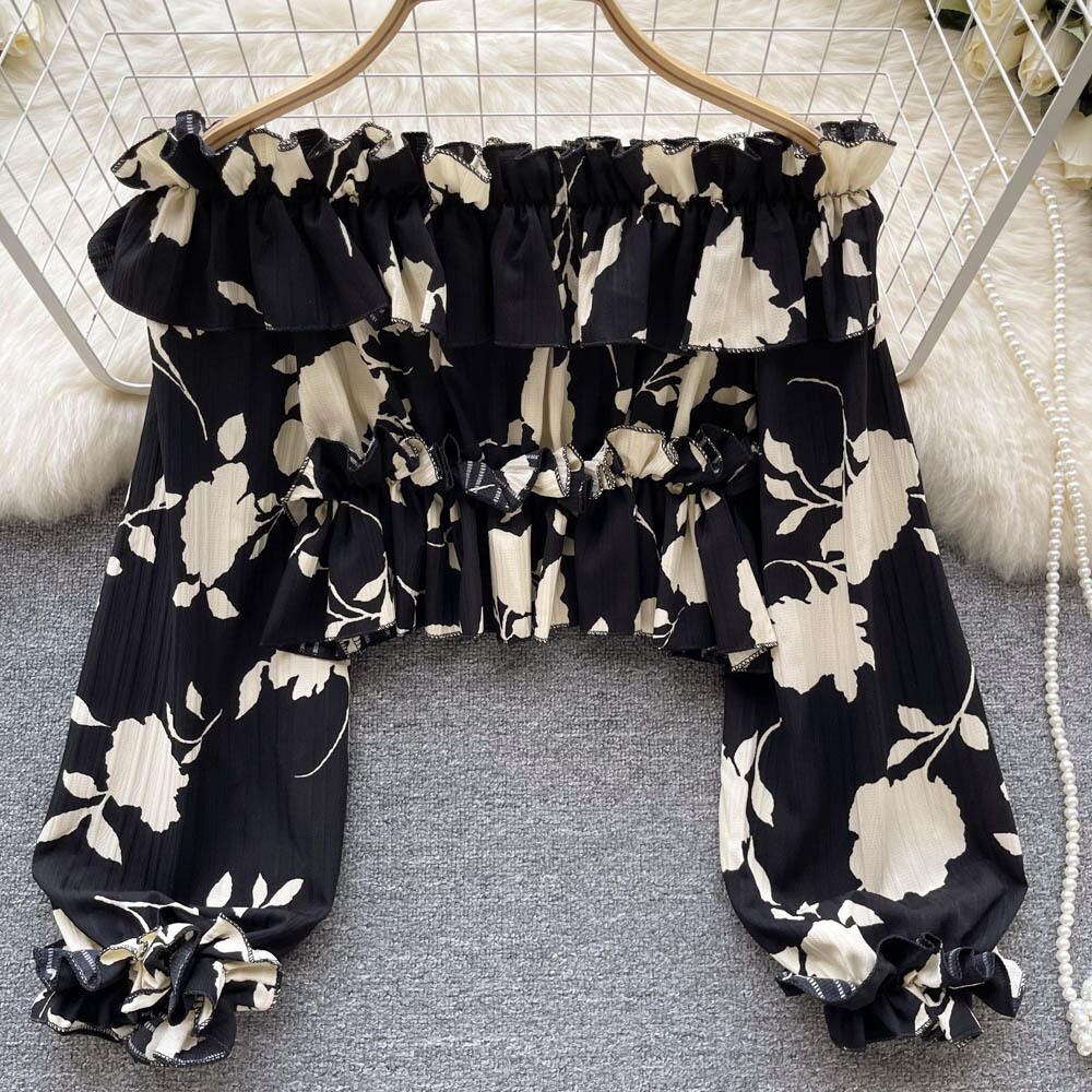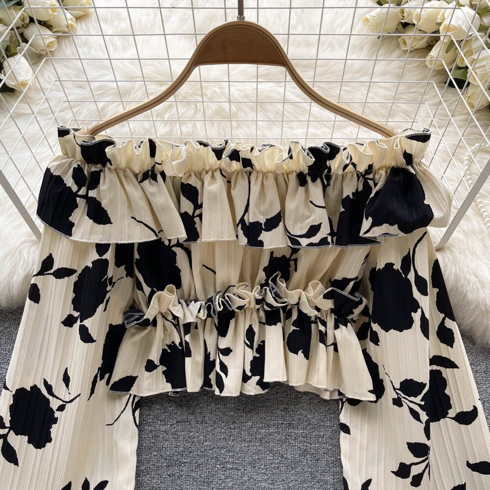 French retro design sense niche print one-shoulder shirt top autumn chic beautiful small shirt long-sleeved shirt ロング レトロ オータム 秋物 lyxaj59609509455