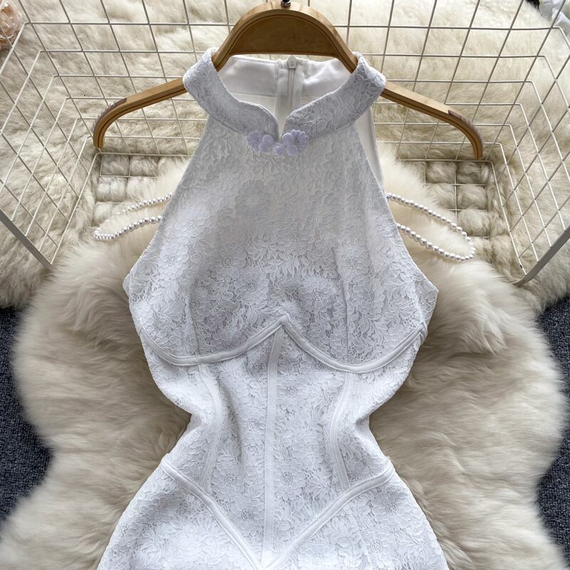 レースドレス夏の女神ファン気質レトロ改良チャイナ襟セクシーなオフショルダーホルタードレススカート サマー 夏物 lyxaj18105094643