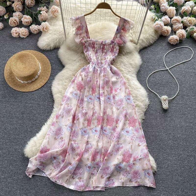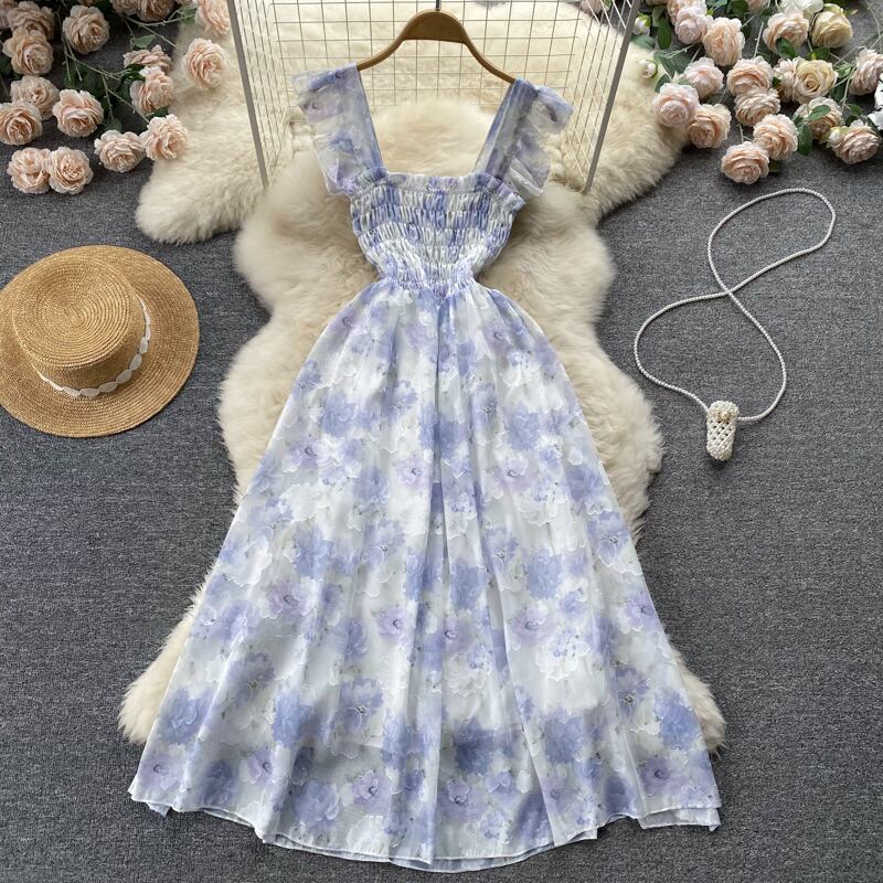 フランスのレトロな油絵プリントサスペンダードレス 2022 夏の新しいハイウエストスリムスーパー妖精 A ラインドレス ハイウェスト サマー 夏物 Aライン lyxaj8847349050