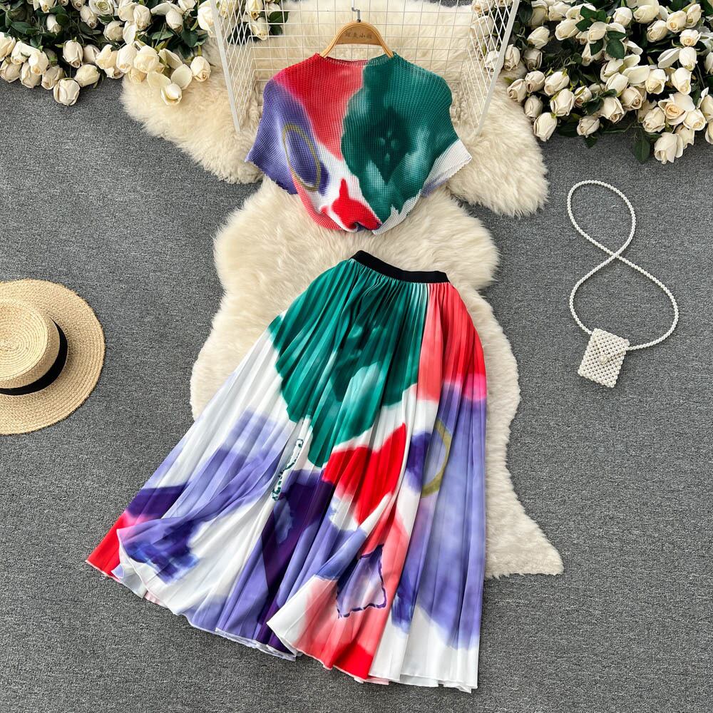 ソルトシリーズ ガーリー感のあるツーピーススーツ レディース サマースタイル タイダイ ショート Tシャツ トップス ハイウエスト プリーツスカート ハイウェスト 夏物 lyxaj69567853020