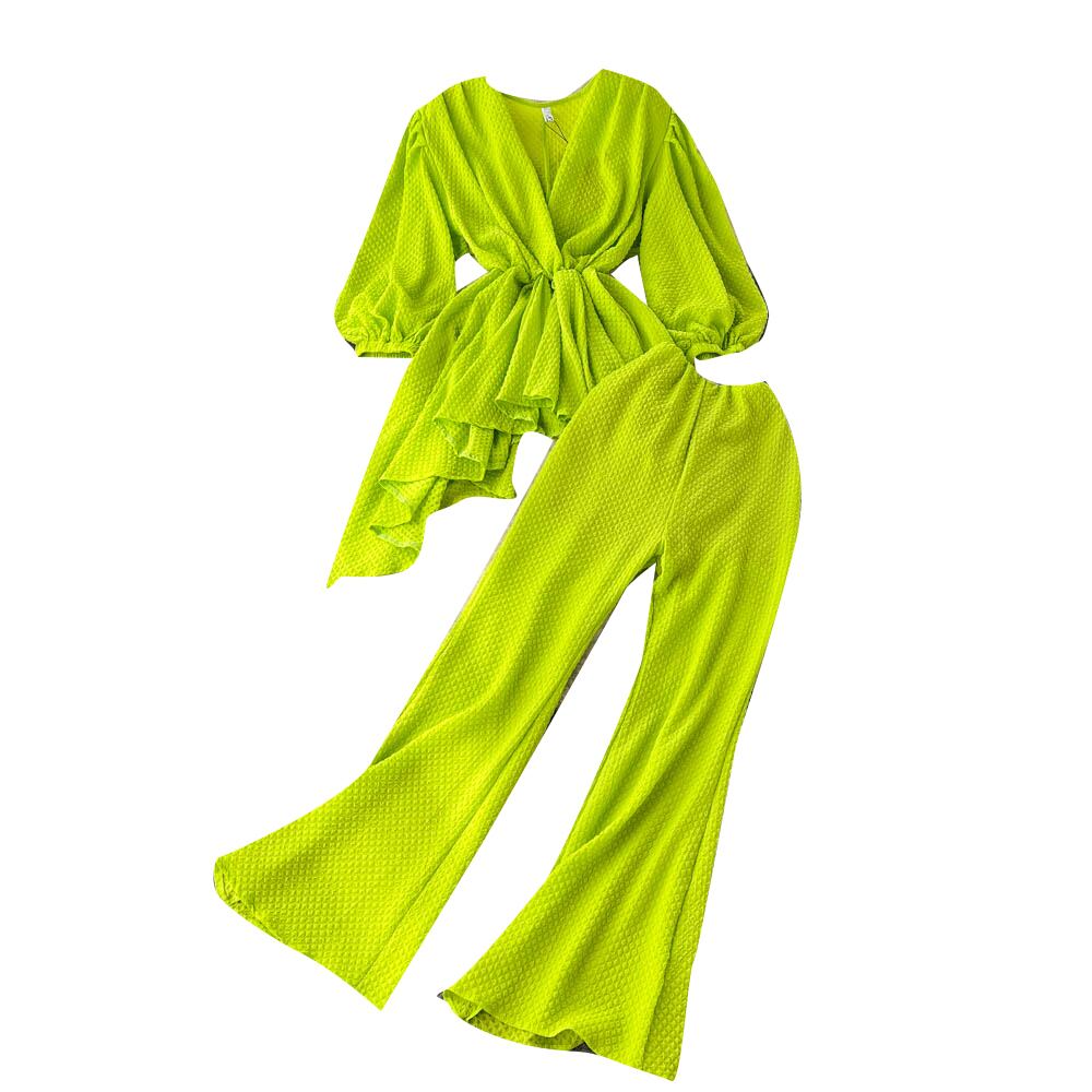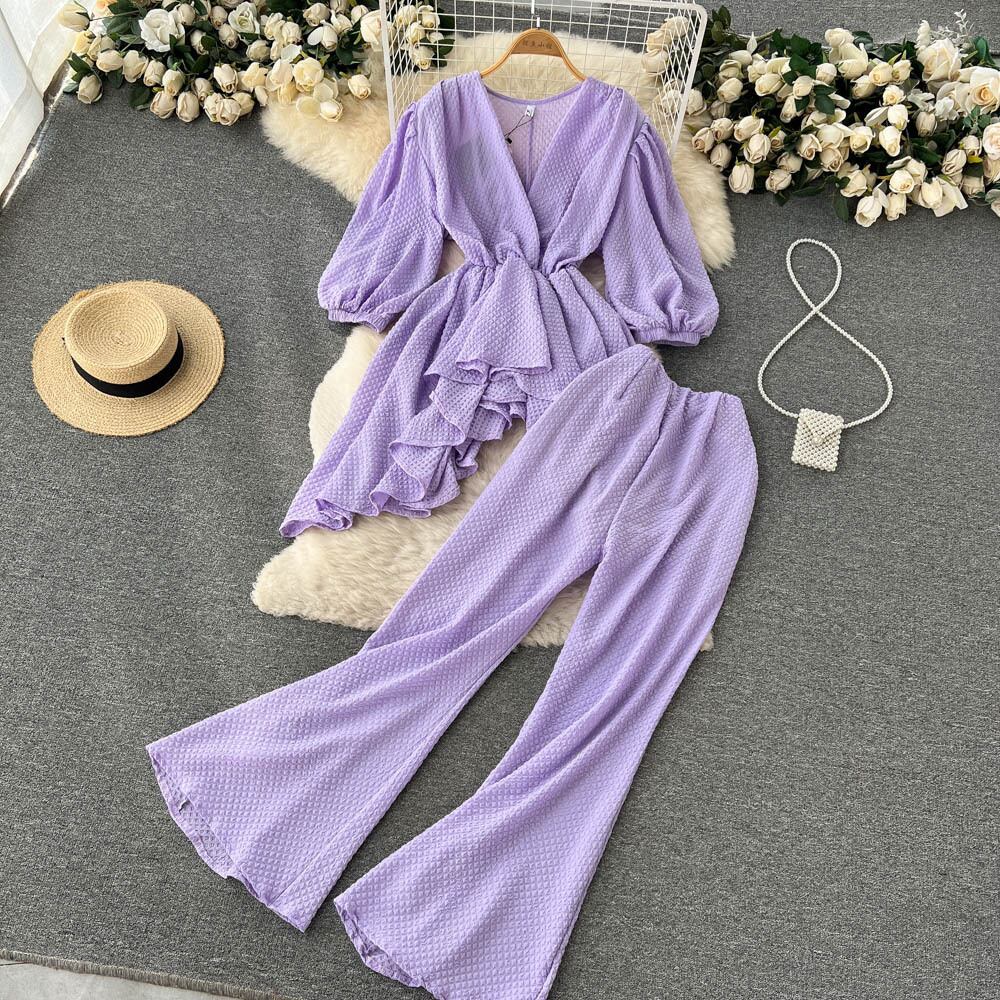 欧米のスーツ、女性の夏のスタイル、小さいデザイン、不規則なフリル、トップス、オールマッチのワイドパンツ、ツーピースファッション ラッフル サマー 夏物 ヨーロピアン lyxaj44505899476