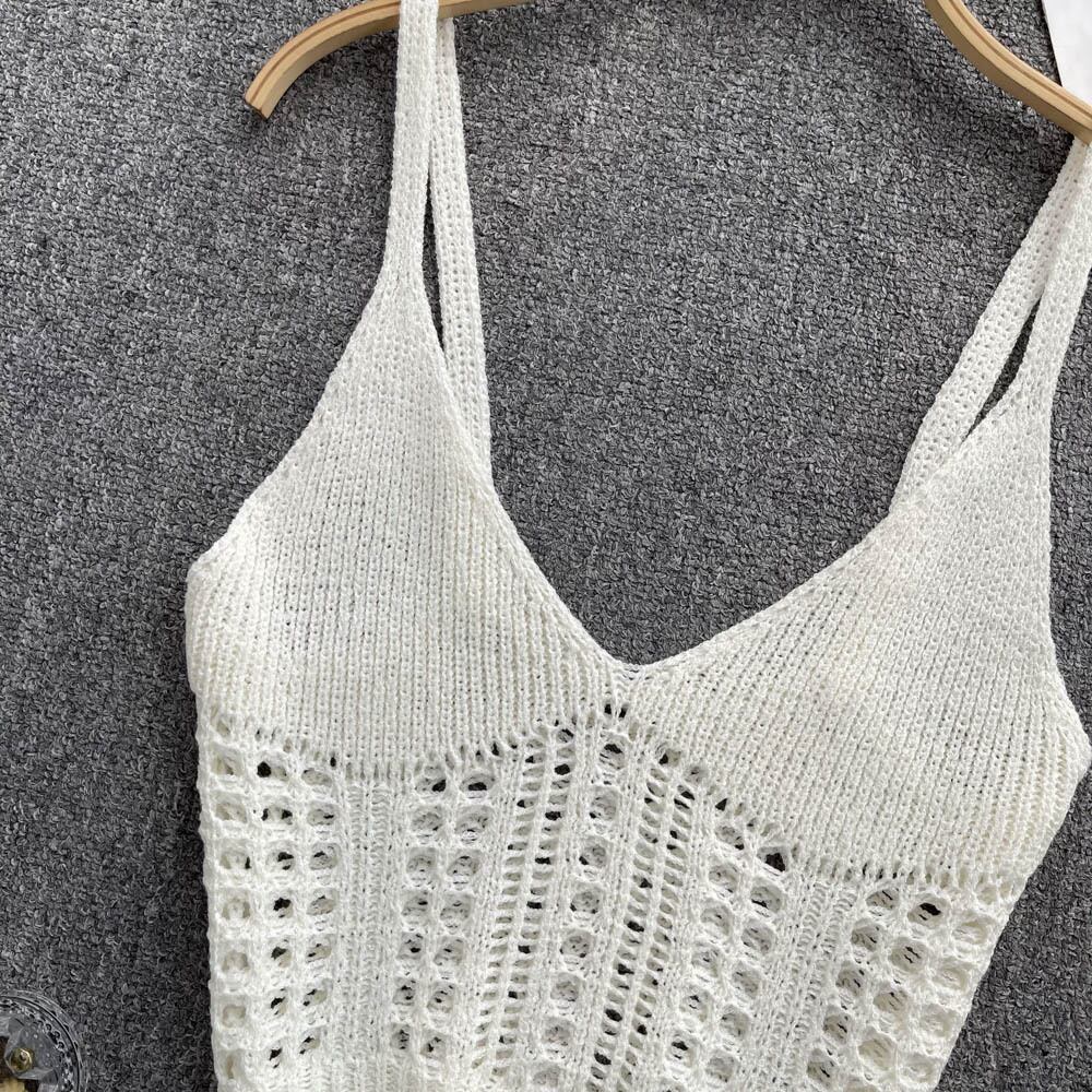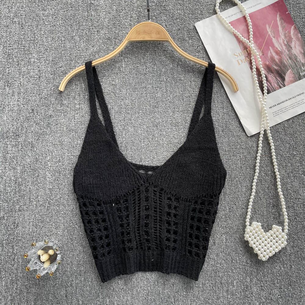 ソルトシリーズフライドストリートサマー中空ニットキャミソール女性ホットガールはノースリーブオールマッチショートディープVネックトップを着用 夏物 lyxaj94793558898