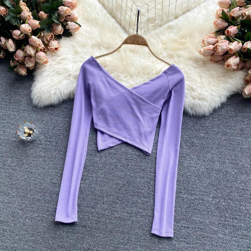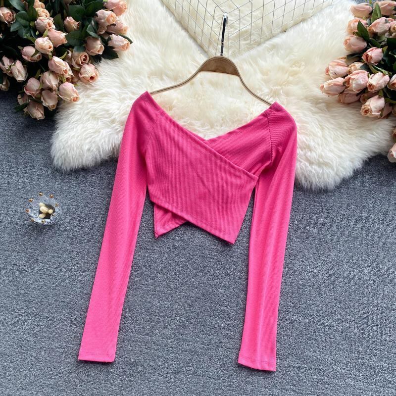 ヨーロッパとアメリカのイントップ女性の夏の新しいセクシーな V ネックスリムショートセクションへそオールマッチ長袖 Tシャツの女性の底入れシャツ ロング サマー 夏物 Vネック ヨーロピアン lyxaj89217138701
