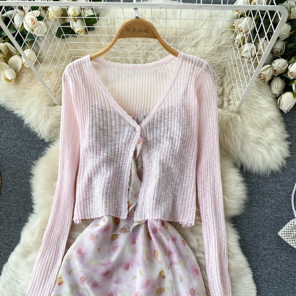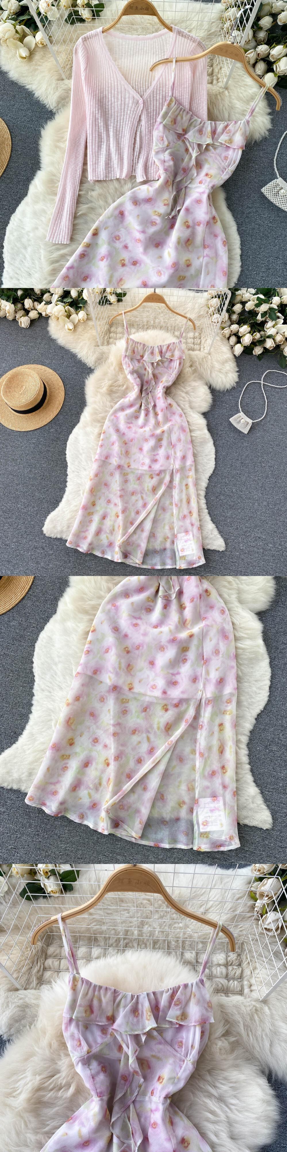 優しい風ツーピース スーツ女性夏日本の大学スタイル長袖日焼け止めカーディガン花柄スプリット サスペンダー ドレス ロング サマー 夏物 lyxaj20982378836