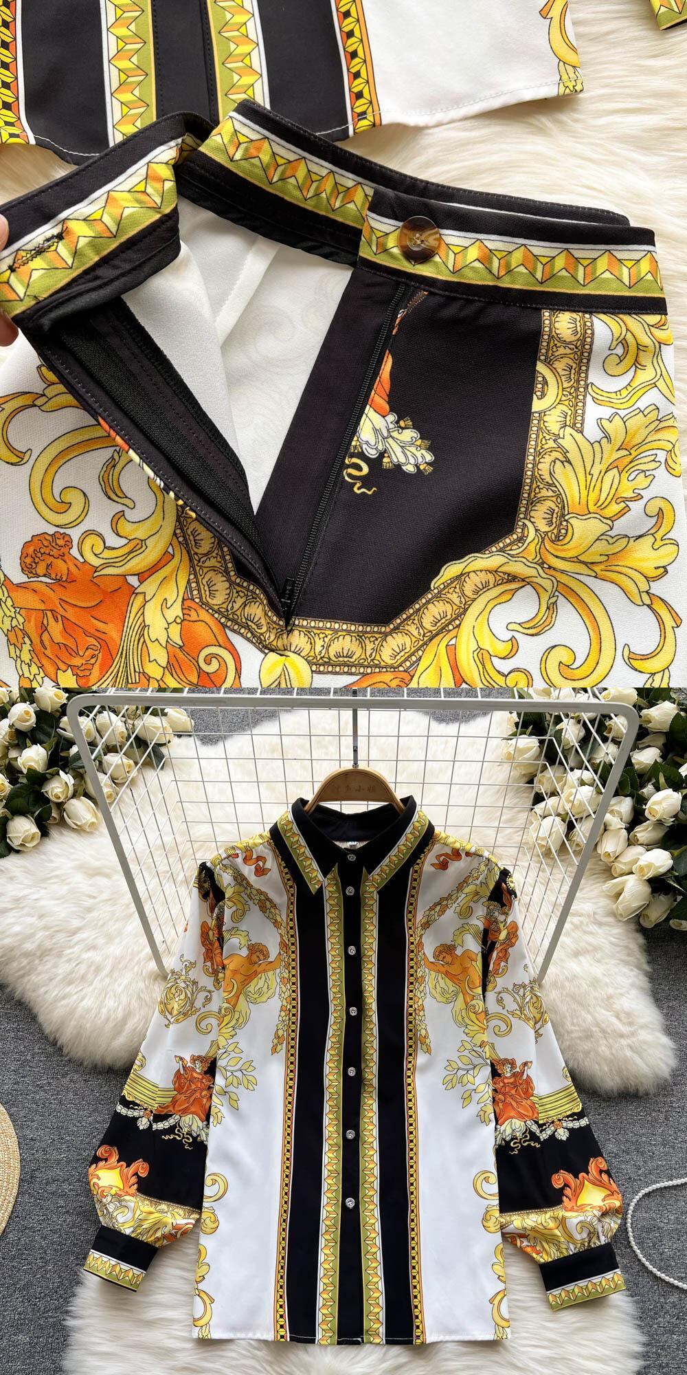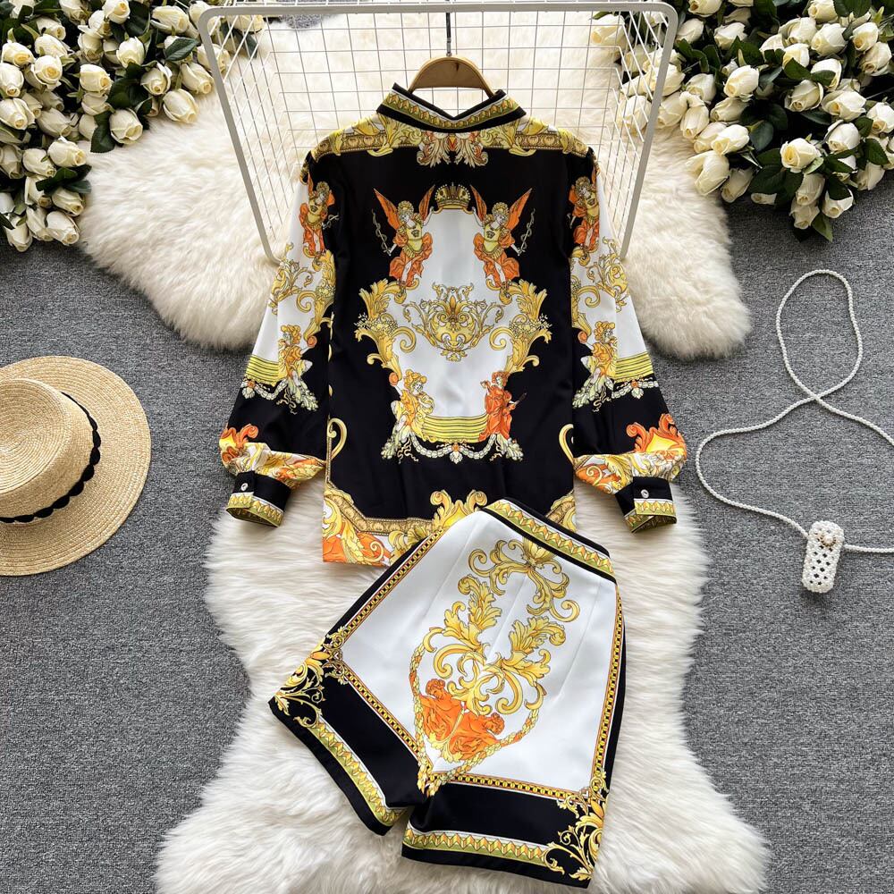 宮殿スタイルのスーツ女性 2022 新プリントルーズ長袖シャツハイウエスト薄型ワイドレッグショーツ 2 点セット ハイウェスト ロング レース ブルマー ワイドパンツ lyxaj70042041964