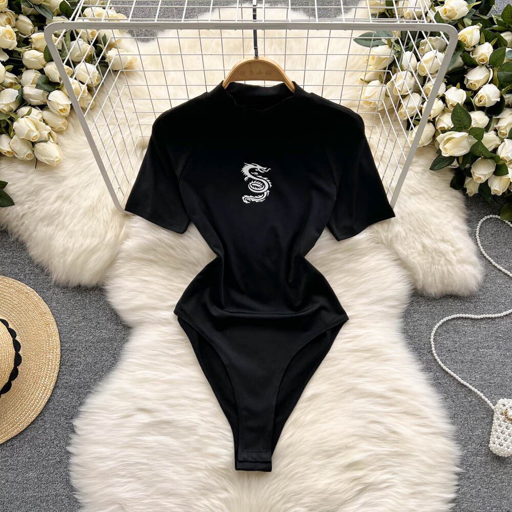 韓国語版ファッションプリント半袖 Tシャツジャンプスーツ女性の夏の新しいスリムフィットと薄い気質立ち襟オールマッチトップ サマー 夏物 lyxaj33463532828