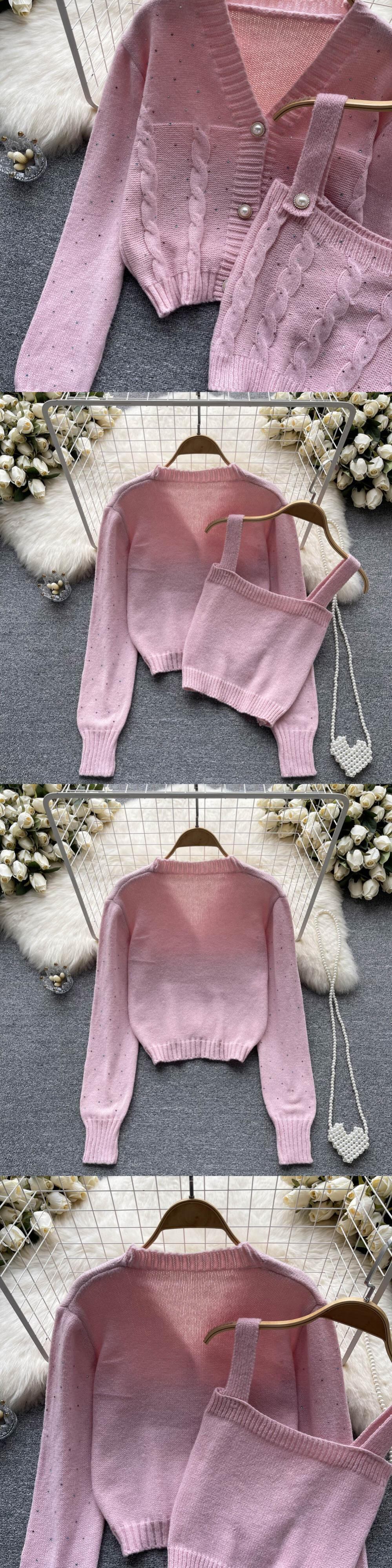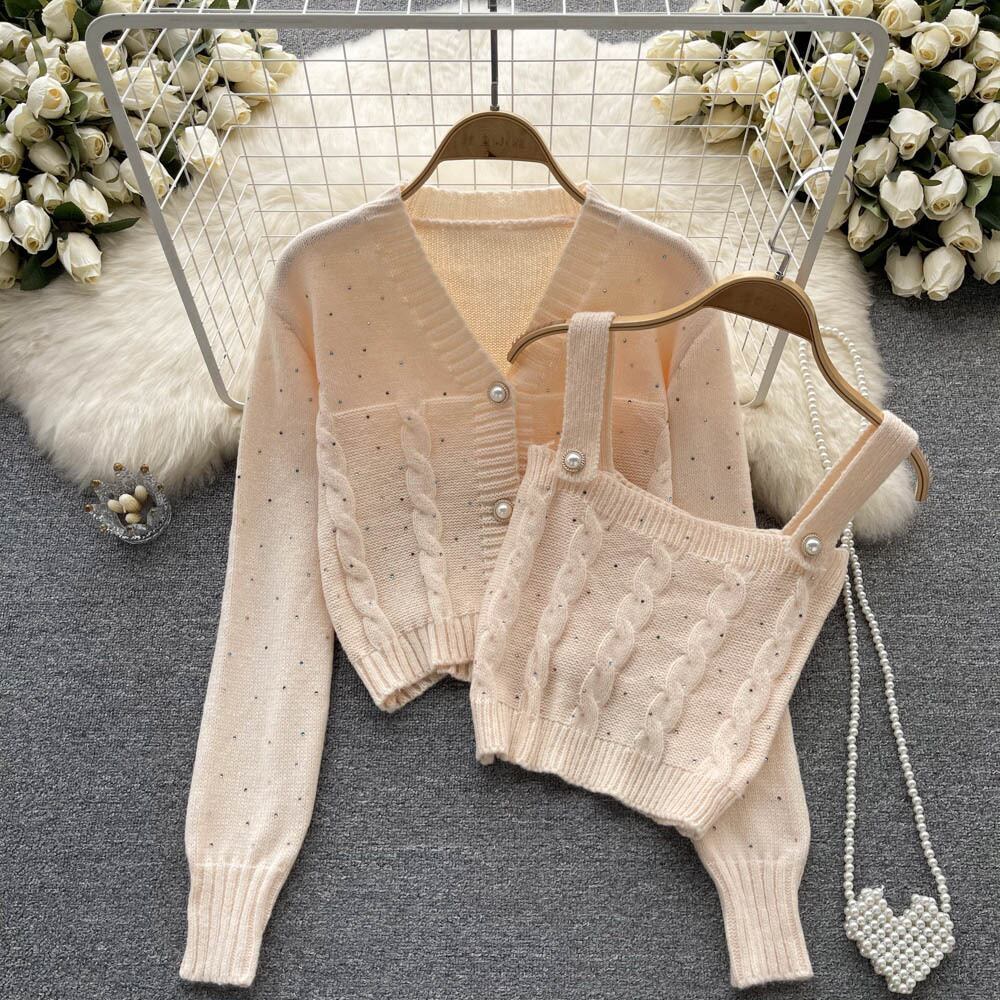 韓国語バージョンのカレッジ スタイル ツーピース スーツ女性の秋の長袖 V ネック セーター カーディガン コート トップ ショート キャミソール ロング オータム 秋物 Vネック lyxaj25028686344
