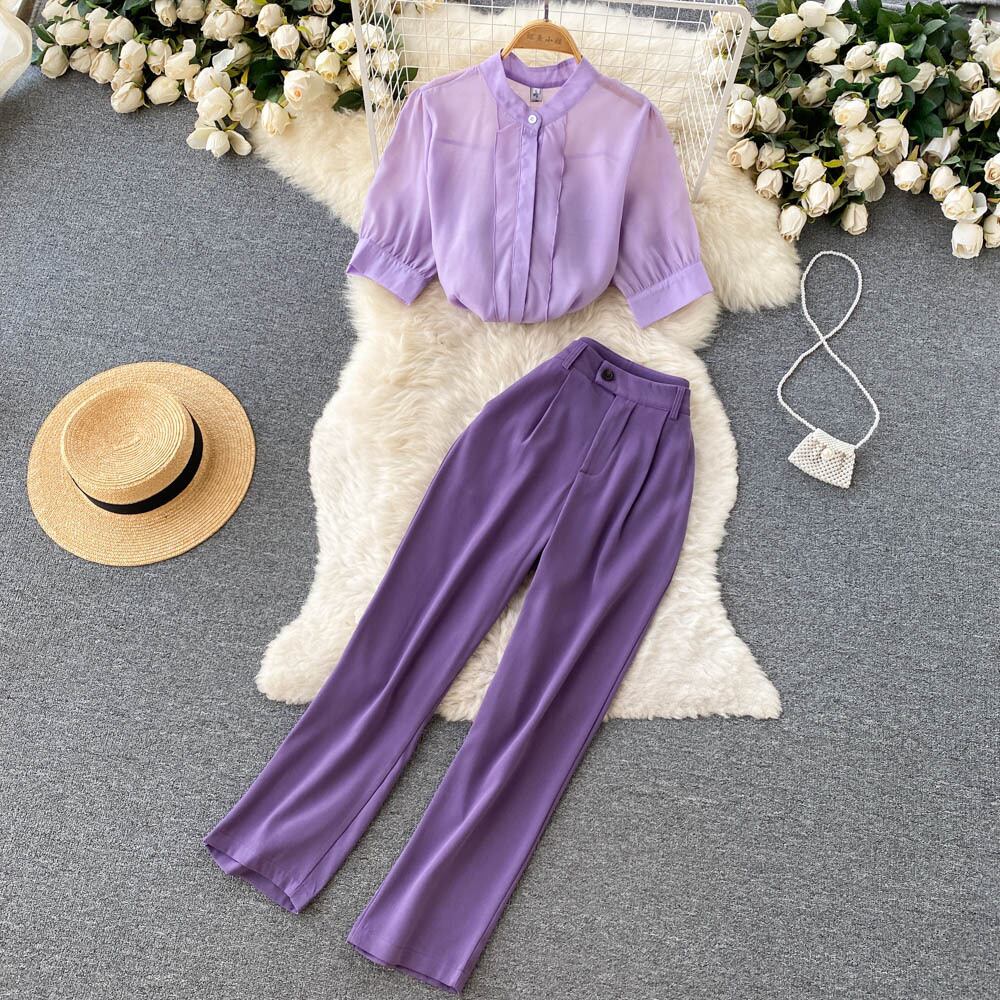 文学的なシンプルなスタイルの夏のスーツの女性の韓国語版半袖メッシュ Tシャツ トップ ハーラン 9 点パンツ ツーピース潮 サマー 夏物 lyxaj37818370342