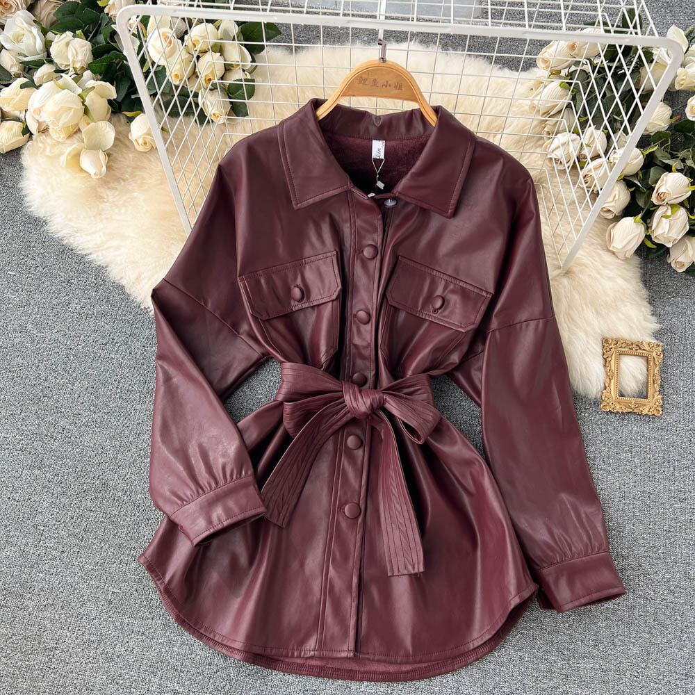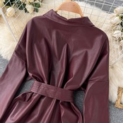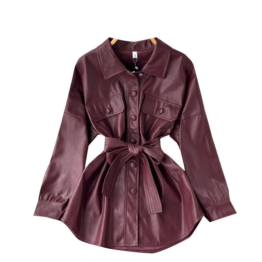 高品質フライドストリート PU レザーミドル丈コート女性の秋の新ファッションウエスト長袖ジャケットトップトレンディなシャツ ロング オータム 秋物 lyxaj72481853444