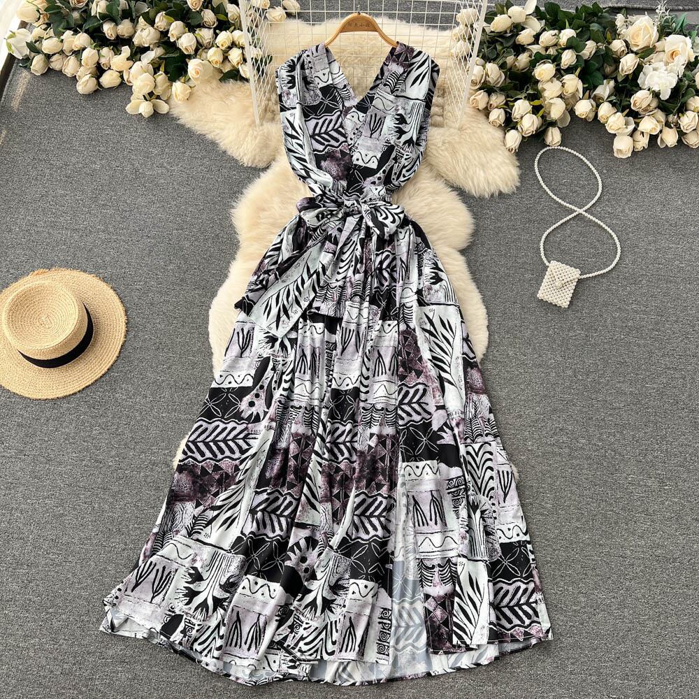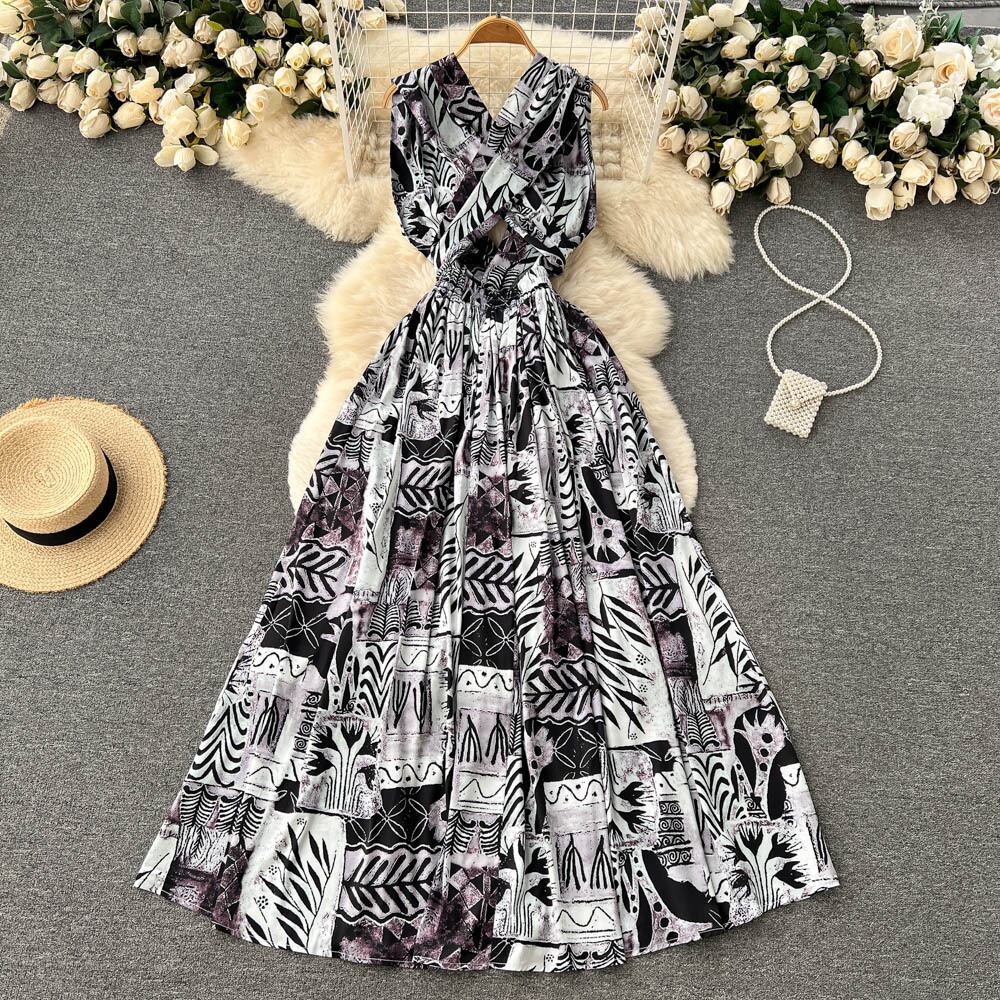 夏の新しいレースアップ ノースリーブ シフォン プリント ドレス女性のミッドレングス花柄スカート韓国語バージョン スリムな気質のスカート サマー 夏物 lyxaj25413884508