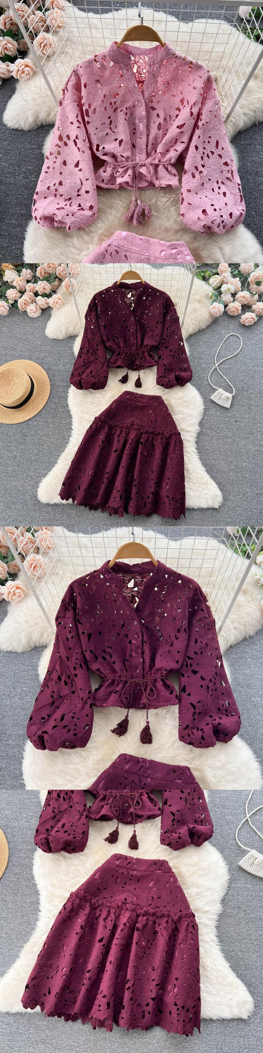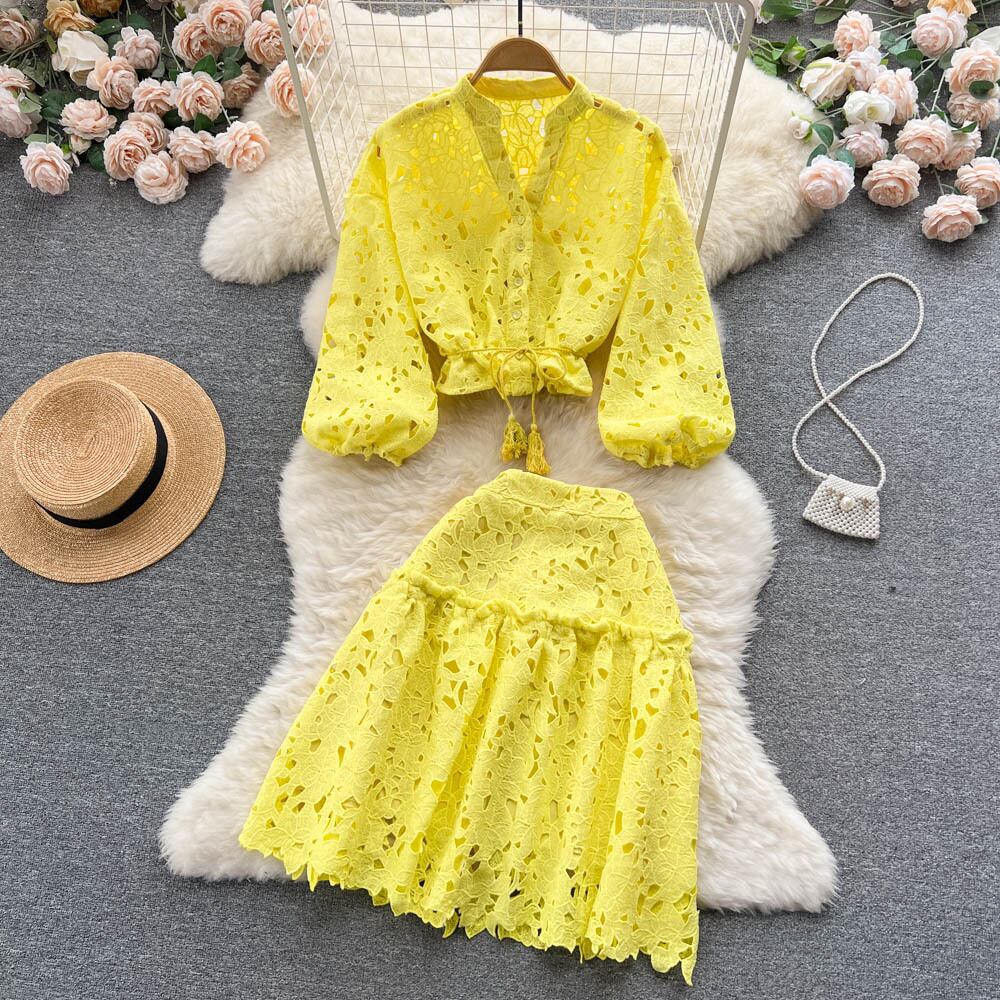 ファッショナブルでファッショナブルなツーピース スーツ女性の夏のスタイル活気のある年齢を減らす中空ランタン スリーブ シャツ トップ ハーフ スカート ランタンスリーブ サマー 夏物 lyxaj68409699295