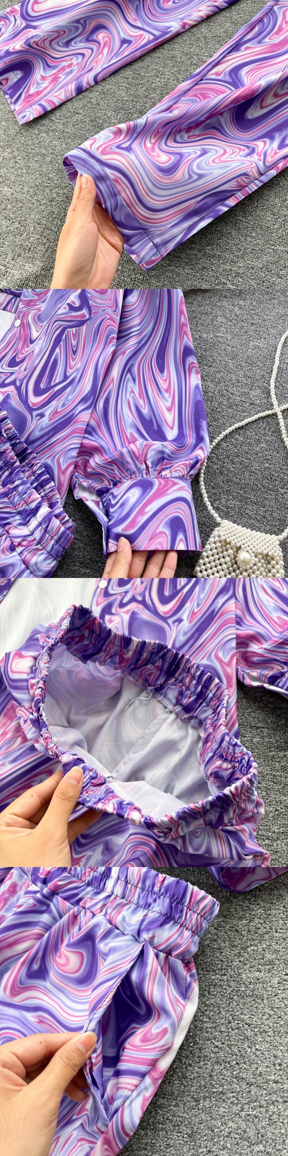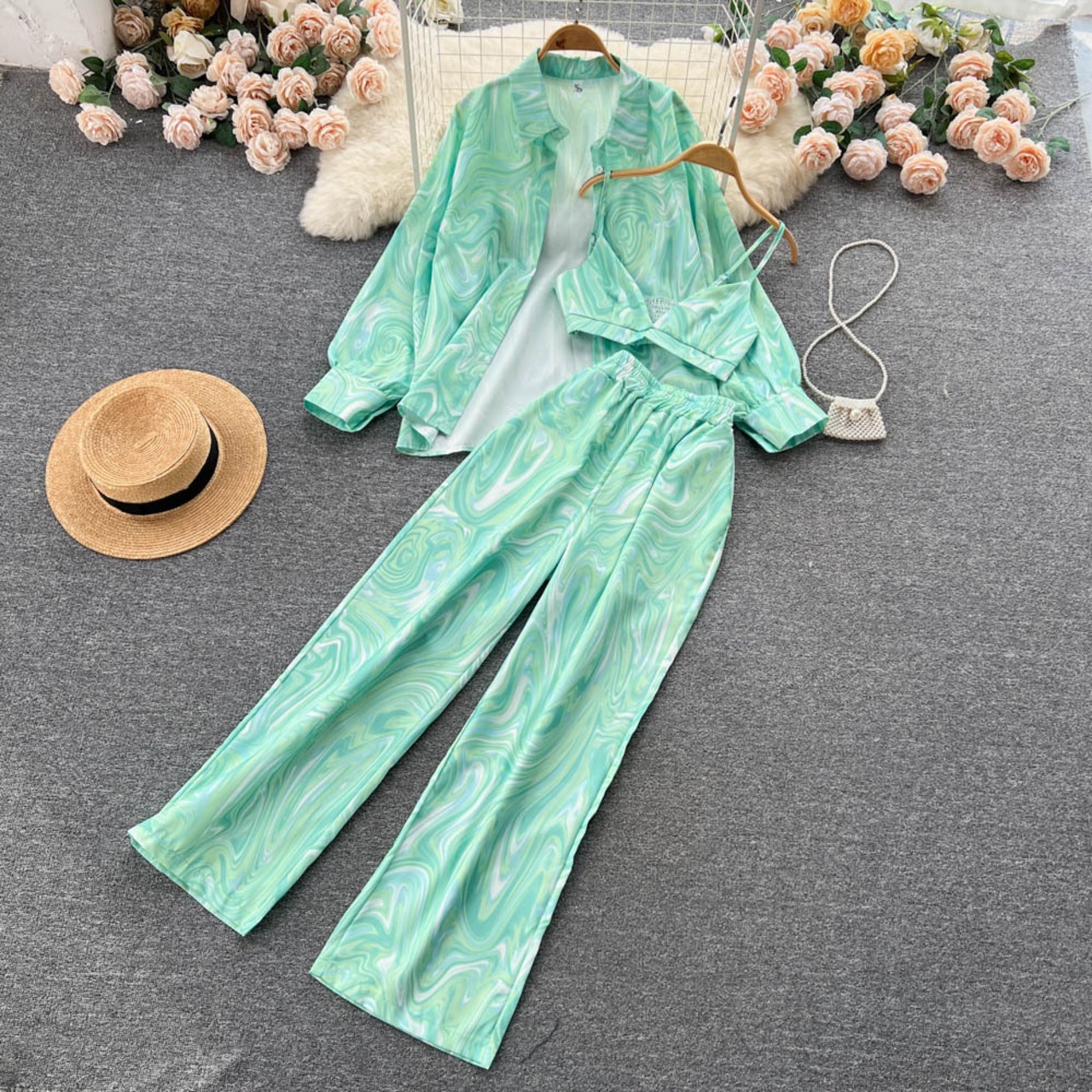 エスニック風 秋 レディース 小さめ キャミソール プリント 長袖 シャツトップ ハイウエスト ワイドレッグ ロングパンツ 3点セット オータム 秋物 lyxaj5581778252