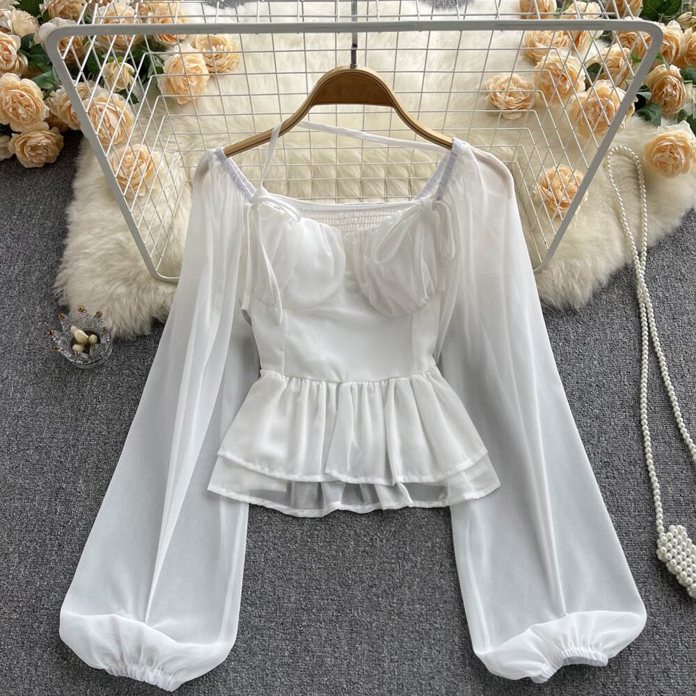 上質なシックで綺麗なスモールシャツ フレンチ鎖骨ランタンスリーブシャツ トップス 夏 レディース レースアップ プリント ショートシャツ サマー 夏物 lyxaj70607324260