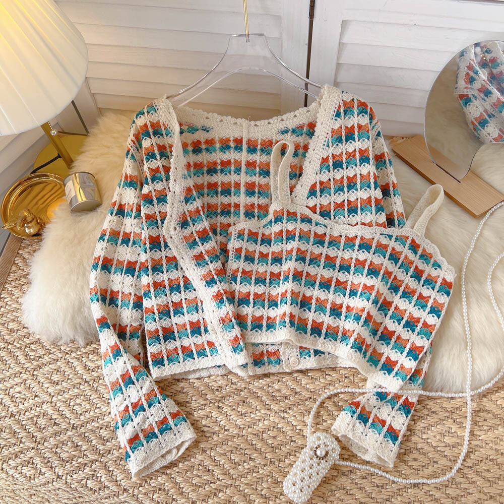 ソルトシリーズ ガーリー感のある着まわしツーピーススーツ レディース 夏風 かぎ針編み 長袖 ニット カーディガン ジャケット ショート キャミソール ロング サマー 夏物 lyxaj20262784060