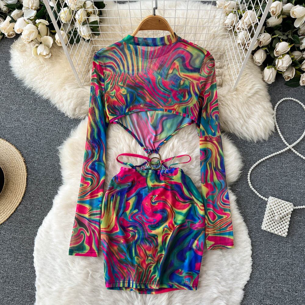 ヨーロッパとアメリカのスタイルのニッチなデザイン中空アウト ウエスト スリム長袖ドレス秋の女性ホット ガール プリント ヒップ スカート ロング オータム 秋物 ヨーロピアン lyxaj40287889458