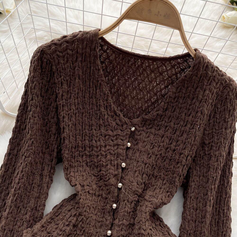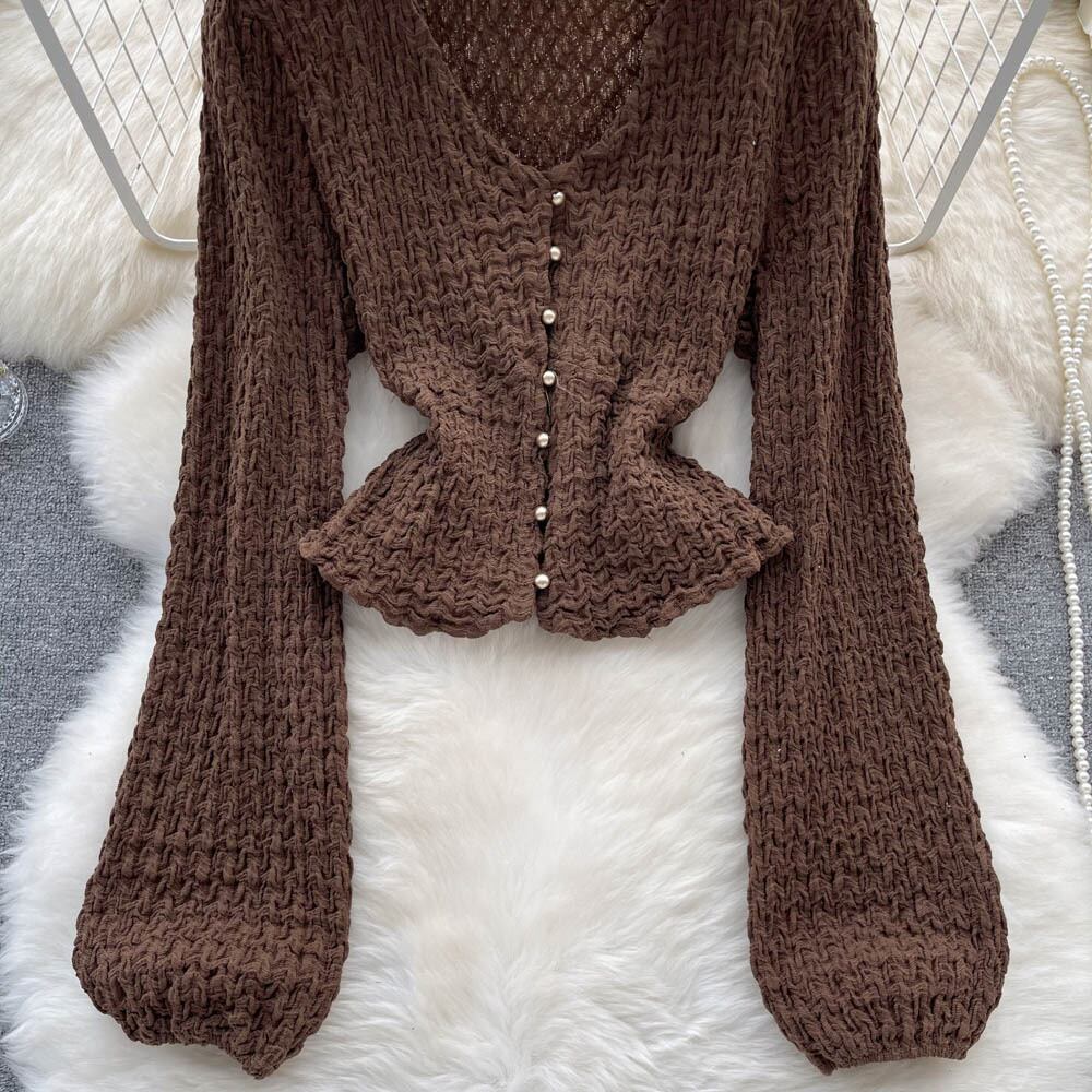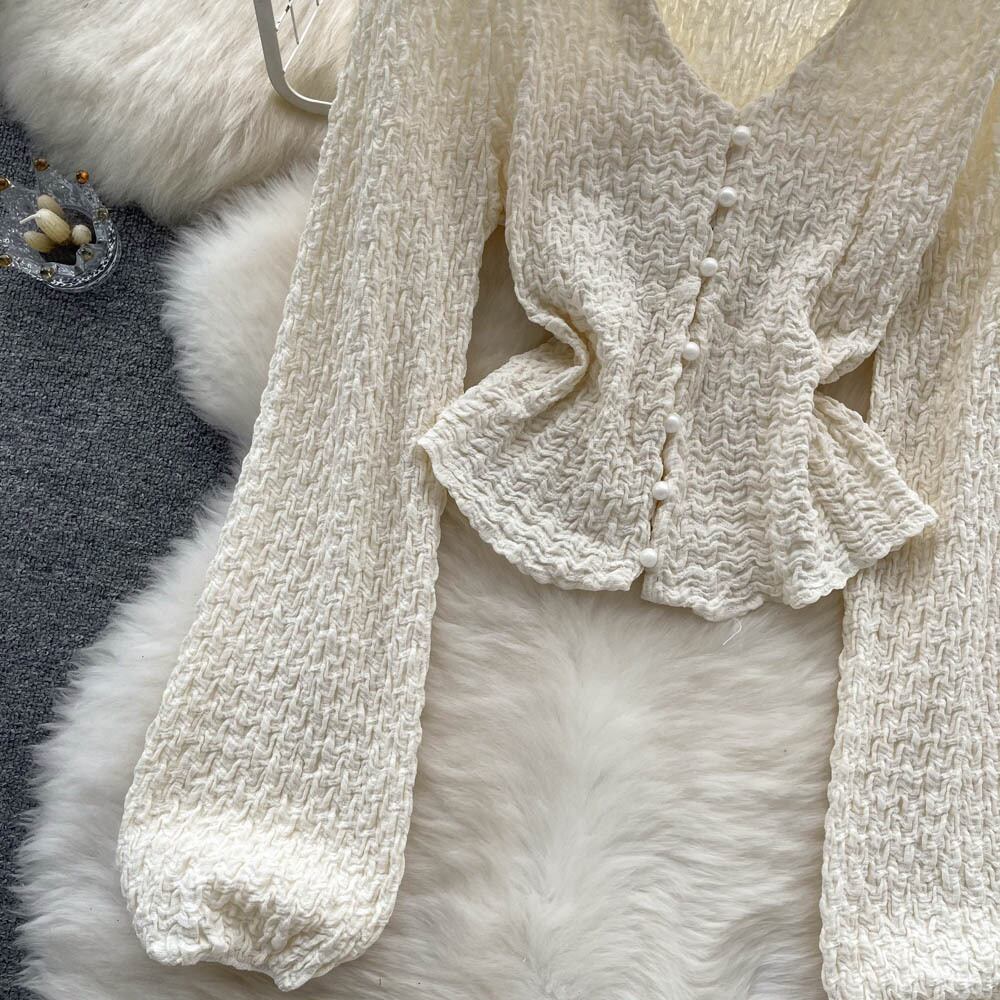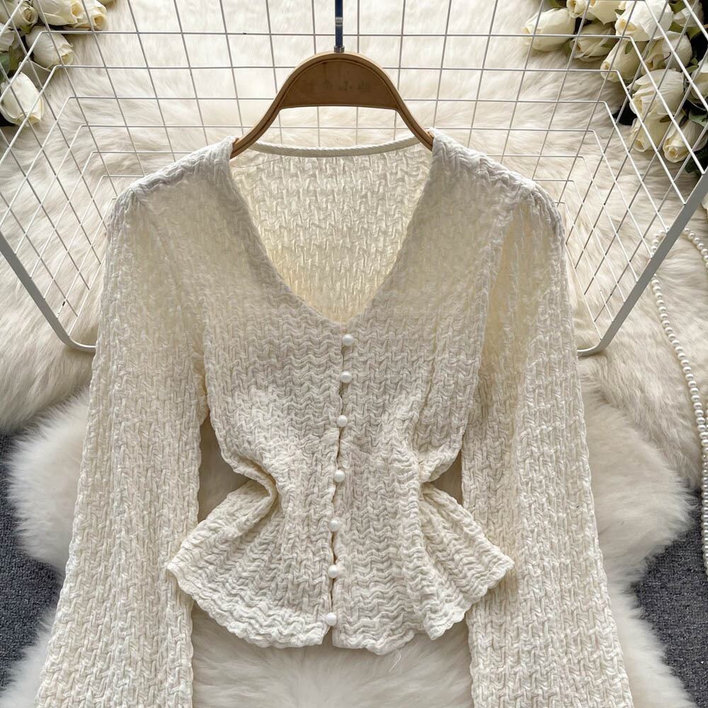 韓国語バージョンの年齢を減らすパフ スリーブ トップ女性の 2022 年秋の新しい気質 V ネック ブレスト スリム ショート ネット赤いシャツ レッド オータム 秋物 Vネック lyxaj2542290920
