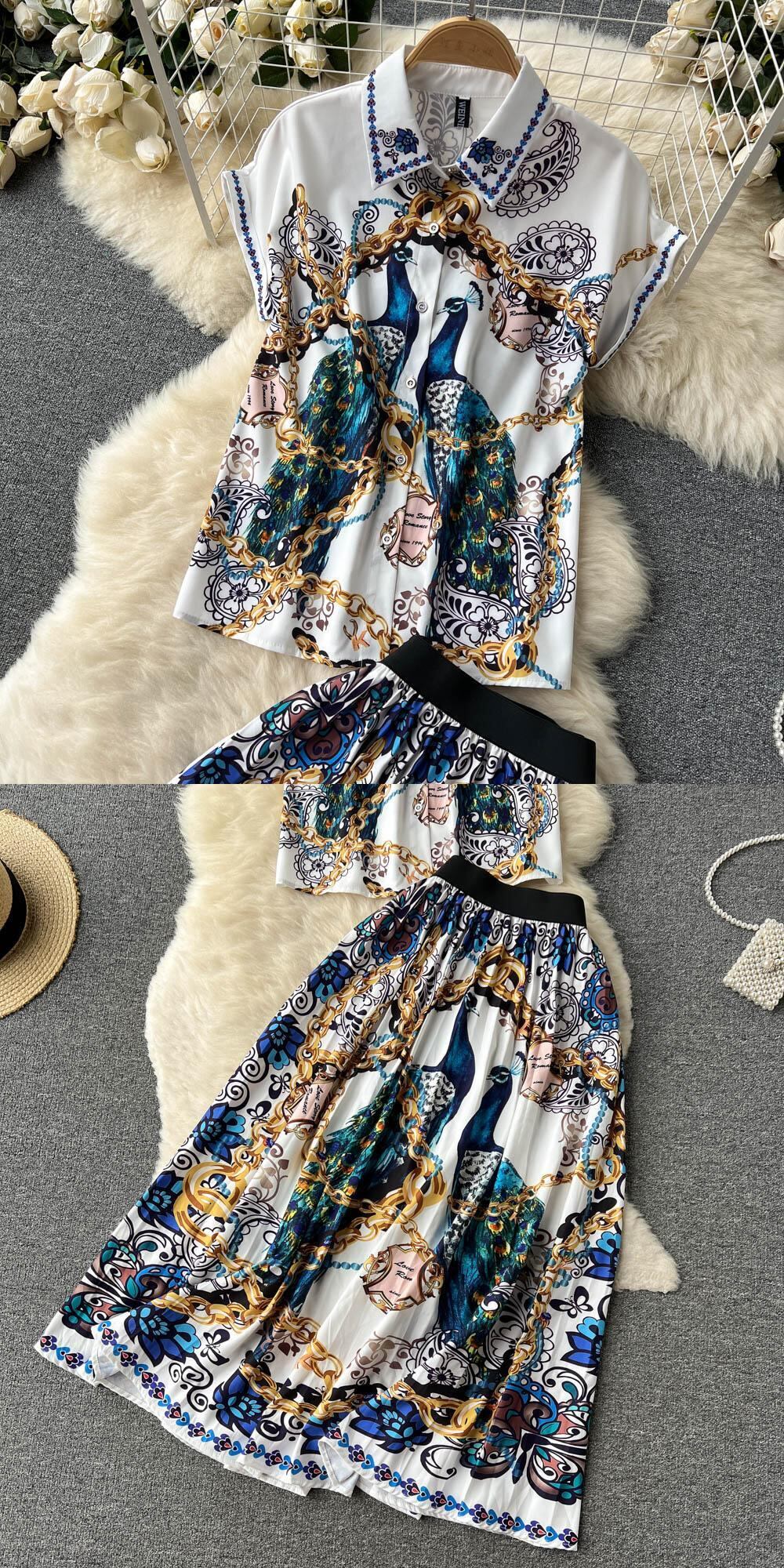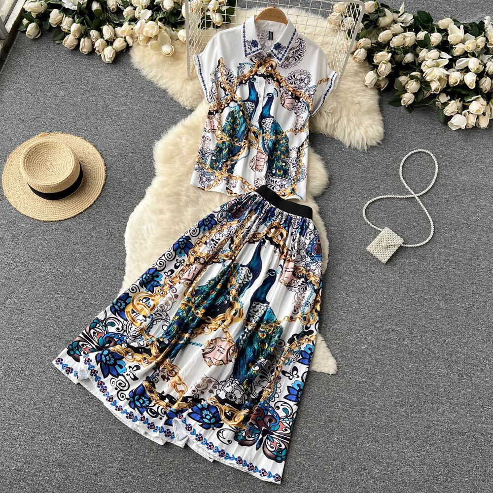 エスニック スタイル ハイエンド プリント ショート シャツ トップ夏の女性 2022 ハイ ウエスト a ライン スカート ツーピース スーツ ハイウェスト サマー 夏物 Aライン lyxaj36882275049