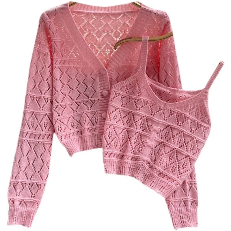 韓国版年齢を下げるVネックニットジャケットレディース長袖ショート2022夏新作中空キャミソール2点セット ロング サマー 夏物 lyxaj53180717924