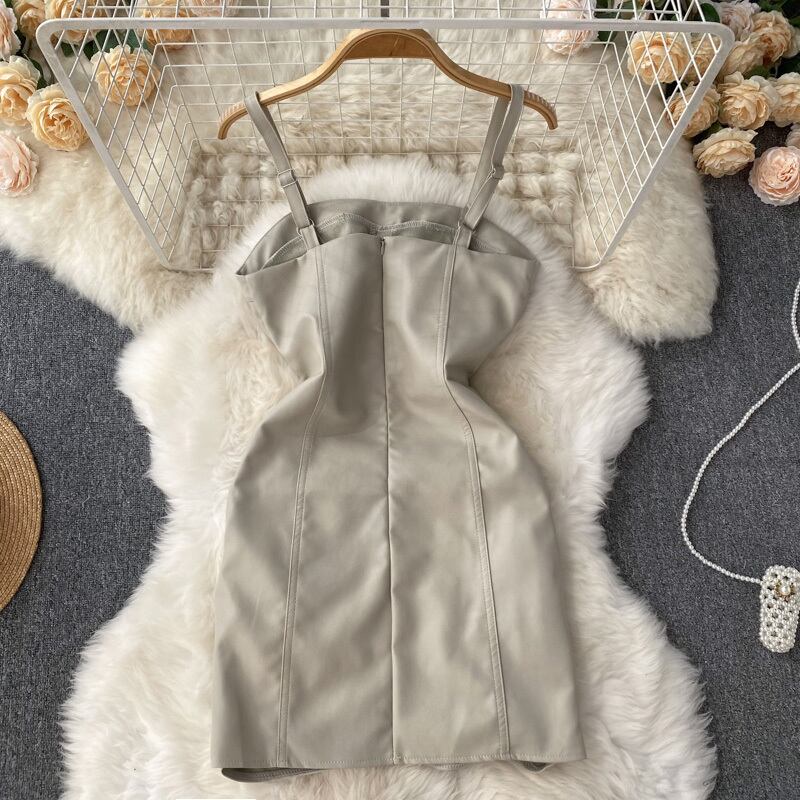 ホットガール PU レザー気質サスペンダードレス秋の女性のハイエンドニッチデザイン折り畳まれたヒップリトルブラックドレス プリーツ オータム 秋物 lyxaj54136494422