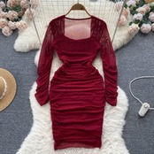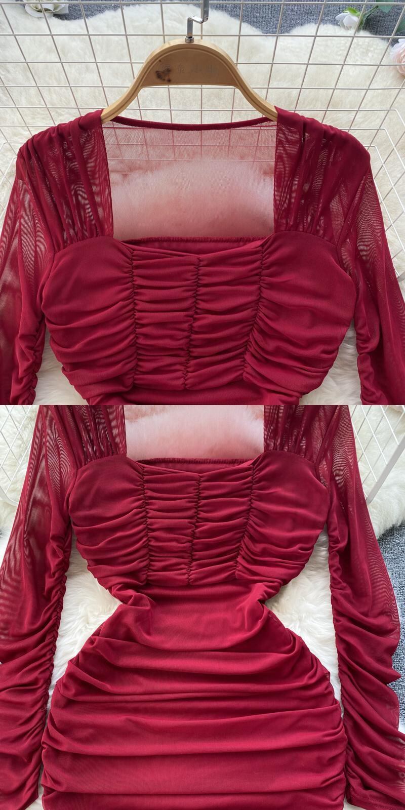 軽い大人のスタイルの赤い気質のスクエアネックドレス秋の女性のホットな女の子のウエストは薄いプリーツの長袖のヒップスカートでした ロング レッド オータム 秋物 スクウェア lyxaj88721269522