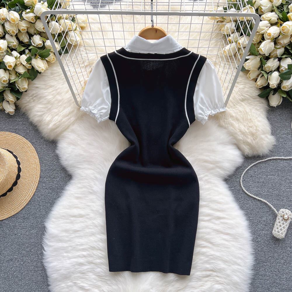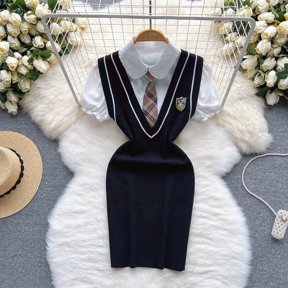 カレッジスタイル 年齢引き締めスーツ 女性 夏 白 パフスリーブ ルーズシャツ Vネック ストラップ ニット ショートスカート 2点セット ホワイト サマー 夏物 lyxaj34464472830