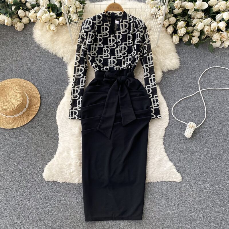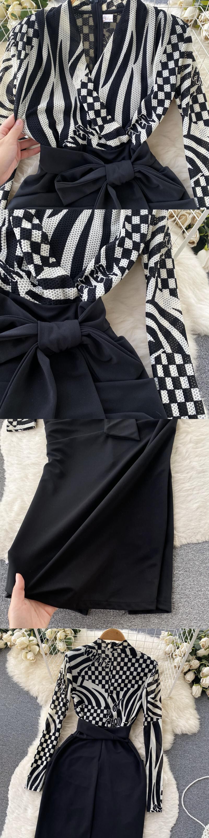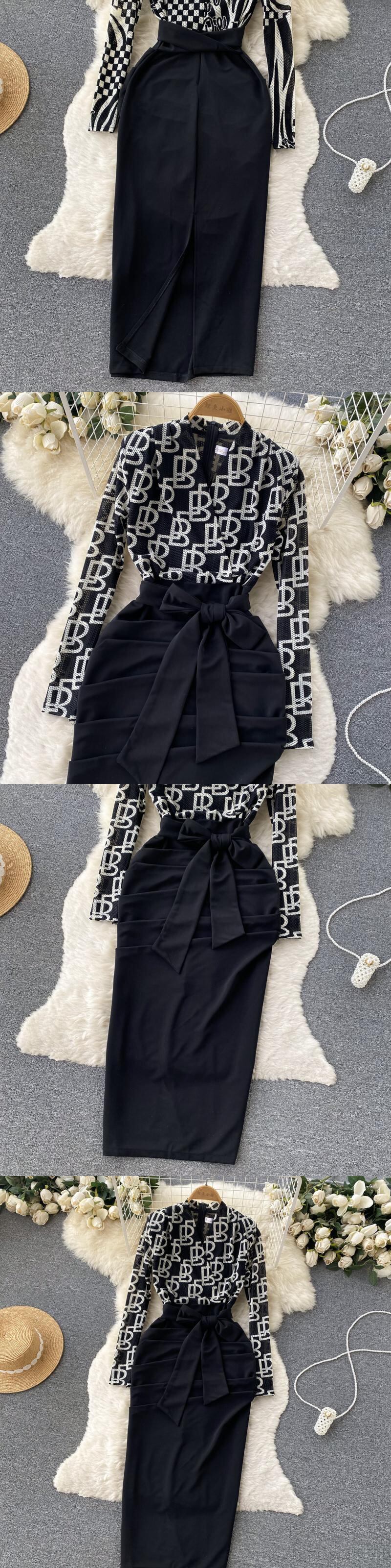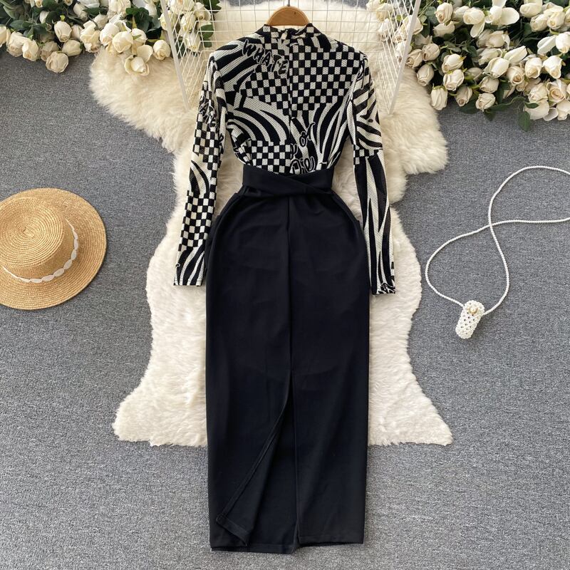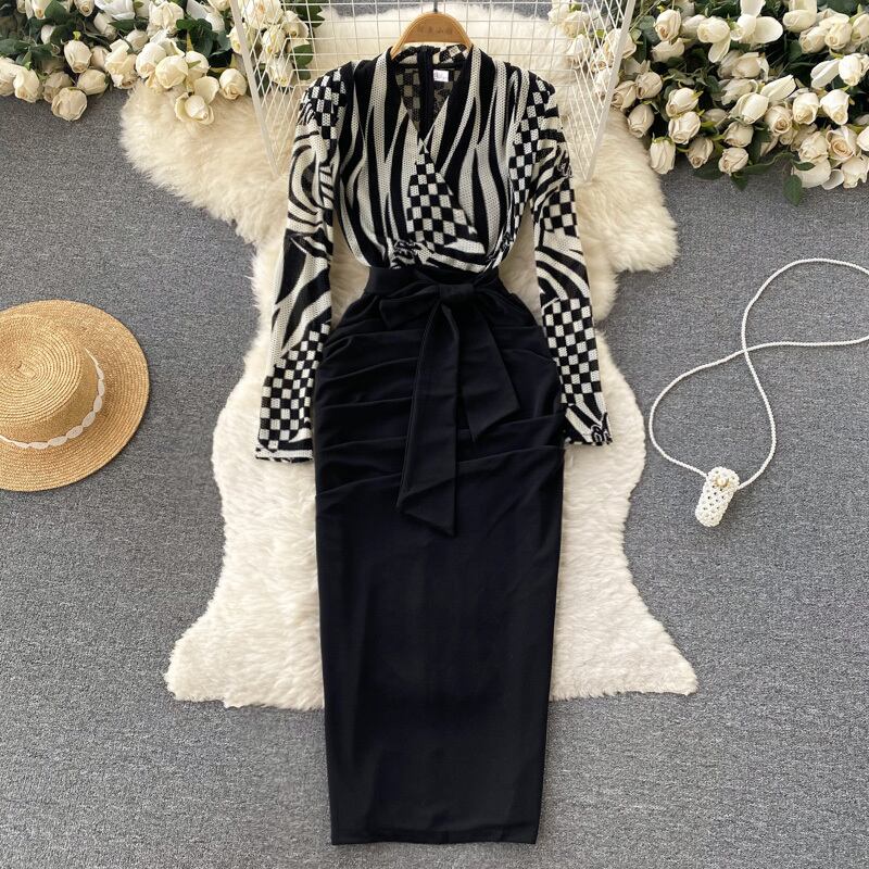 軽やかスタイル ニッチデザイン プリント コントラストカラー Vネックワンピース 秋 ウエスト スリム バッグ ヒップ ロングスカート レディースファッション オータム 秋物 lyxaj71716216562