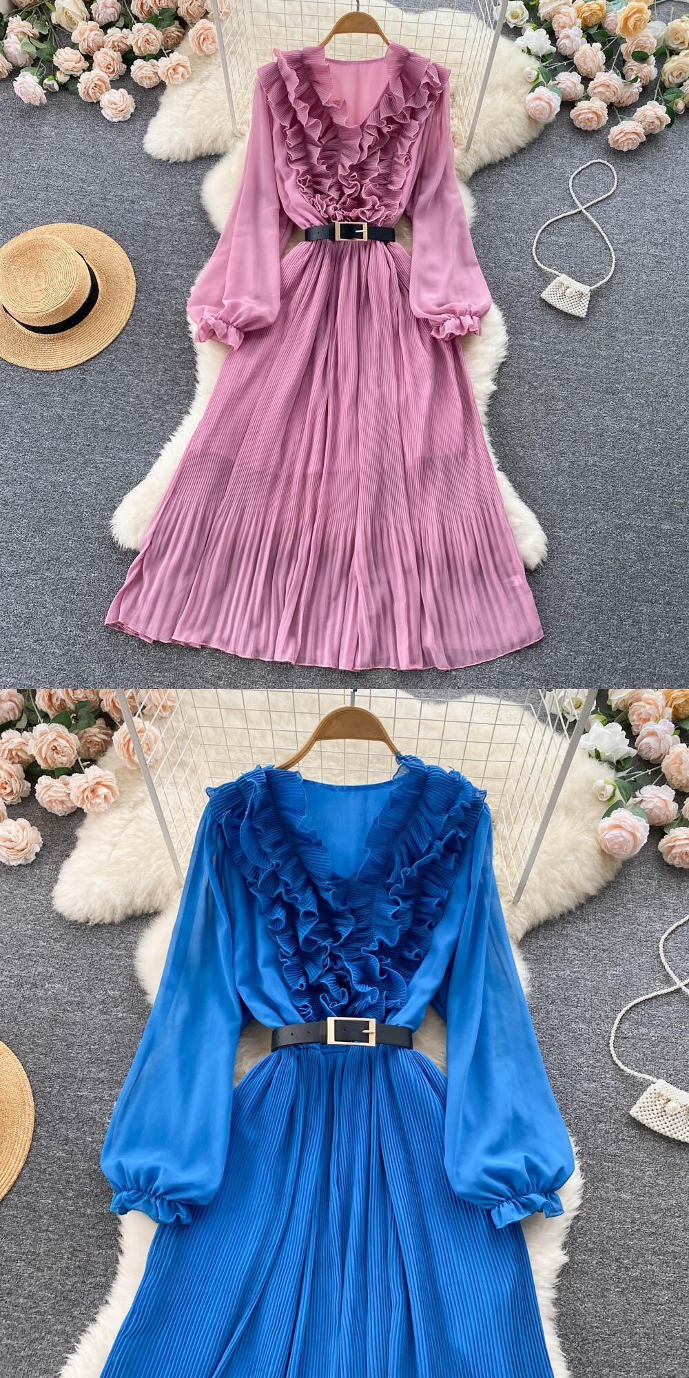 上質な軽やかな大人のスタイル、シックで美しい、フリル気質、Vネックワンピース、夏のレディース長袖ミディスカート ロング サマー 夏物 lyxaj57820862294