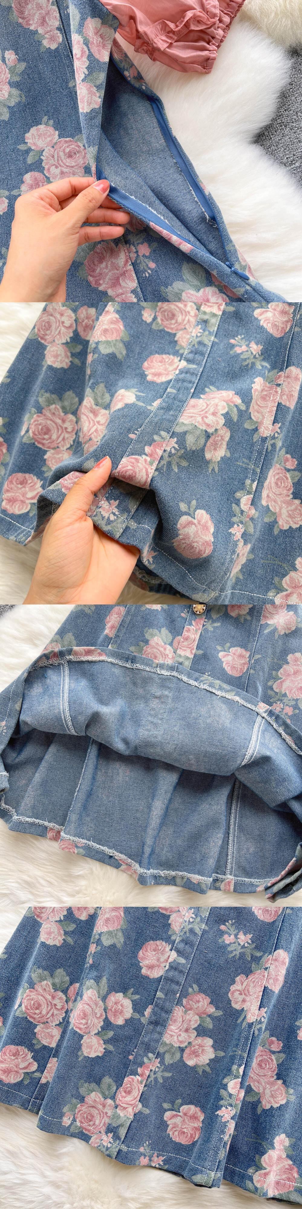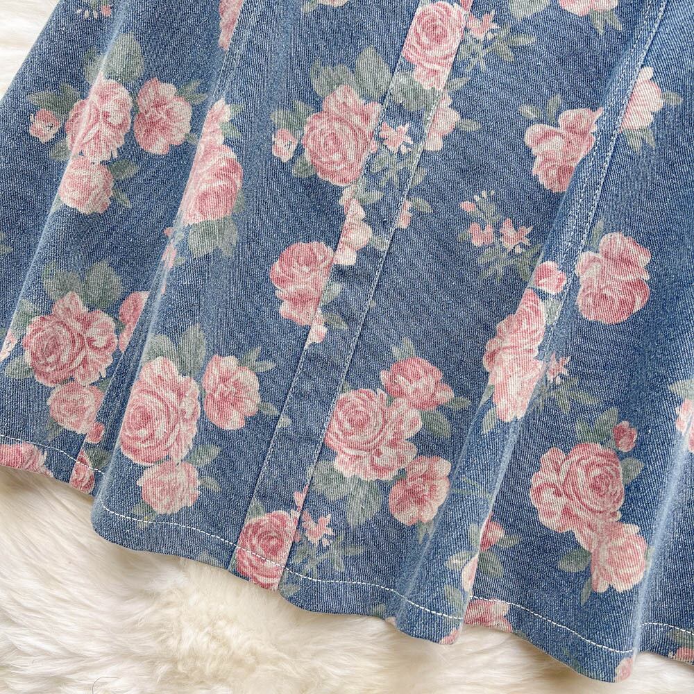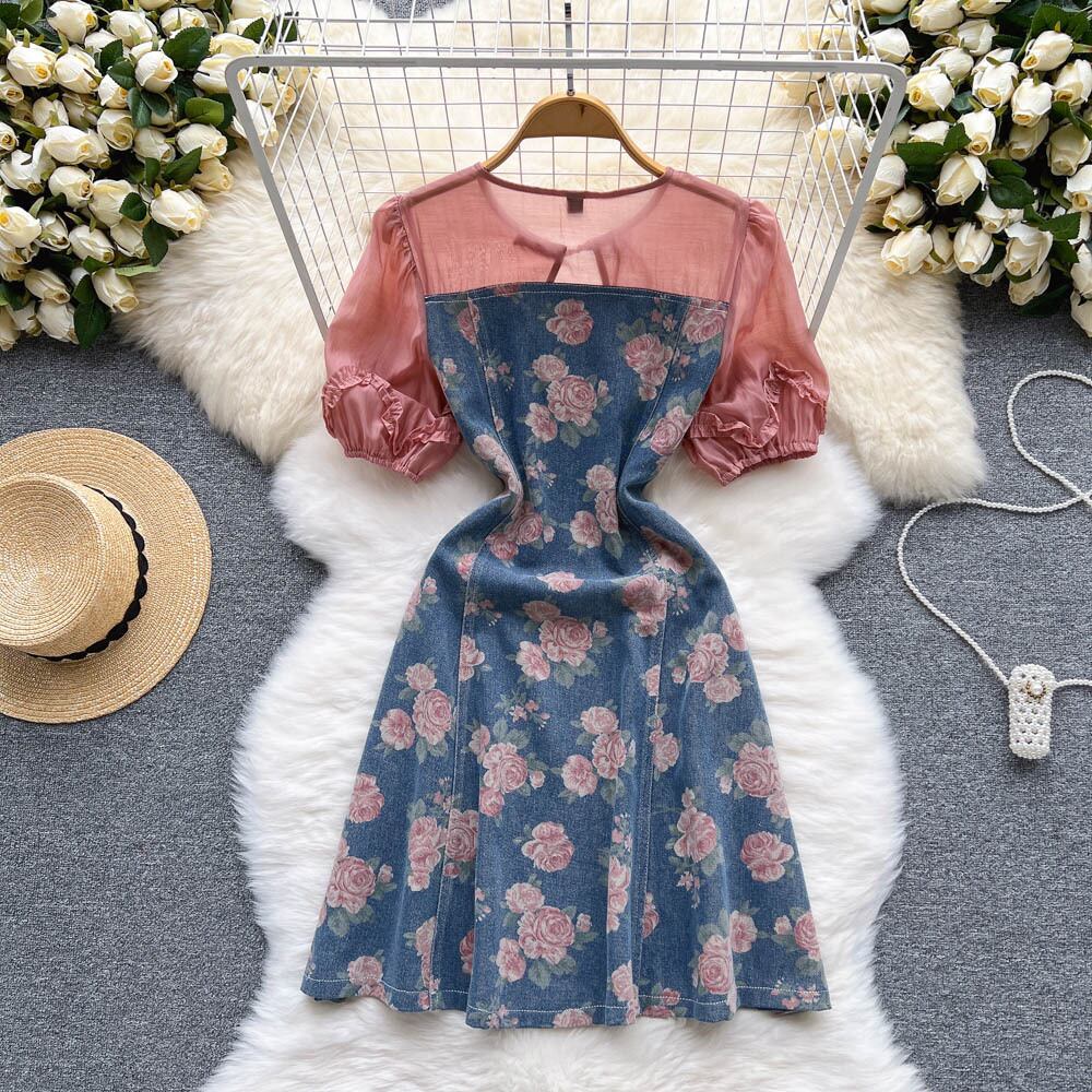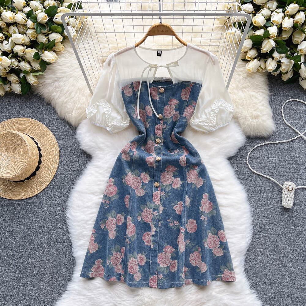 甘い女の子の年齢を減らす花柄のデニムのドレスの女性の2022年夏の新しい自己修養の気質パフスリーブAラインのスカート 大人ガーリー スウィート キュート カジュアル サマー 夏物 lyxaj63521153291