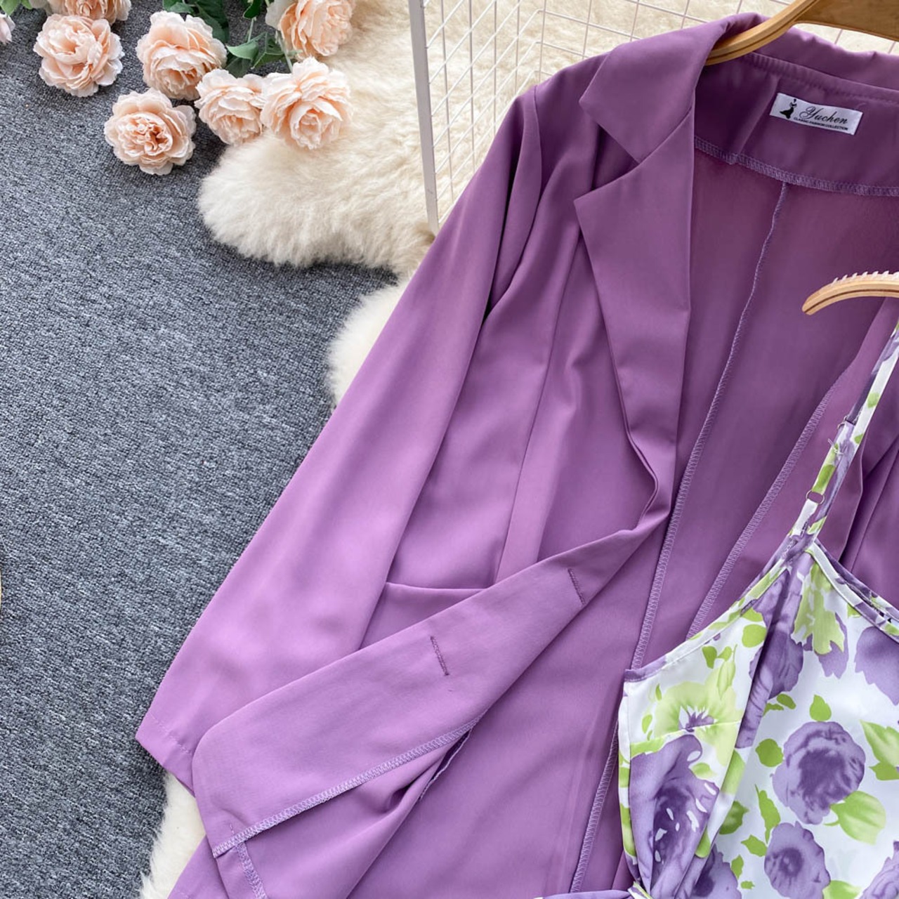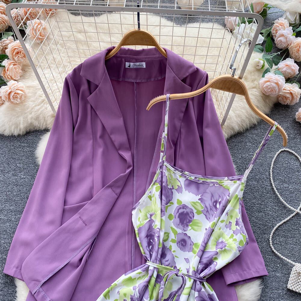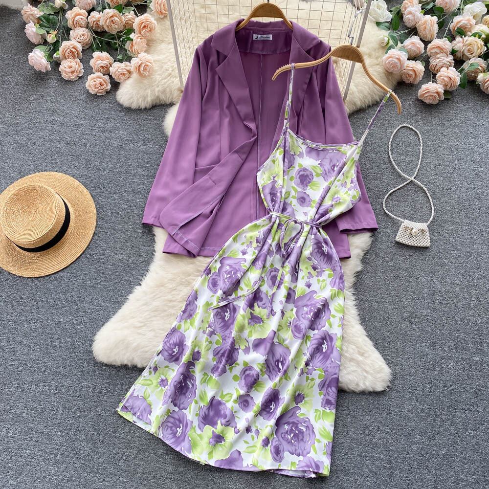 甘くてしょっぱい 甘い花柄スーツ レディース レースアップウエスト 万能スリングワンピース+カジュアルジャケット ツーピースセット 大人ガーリー スウィート キュート lyxaj45449697618