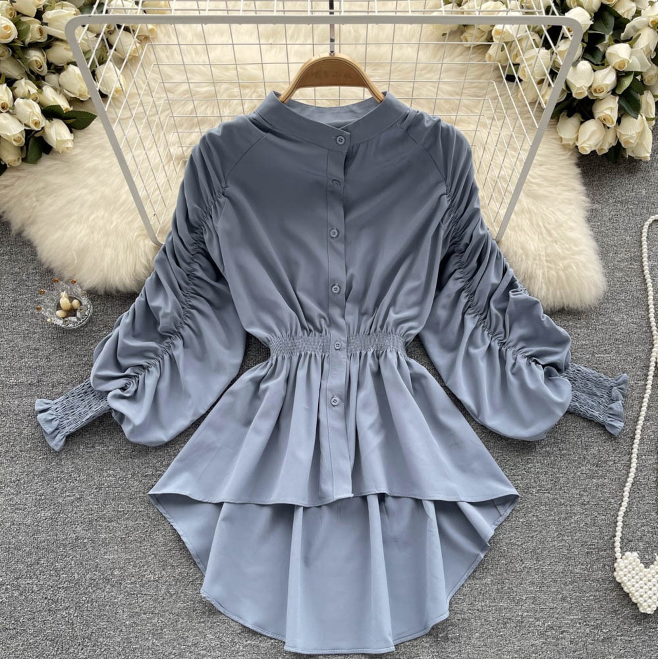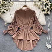 上質なニッチなデザイン感のイレギュラーフォールドウエスト長袖シャツトップス 秋のレディース シックで綺麗な小さめシャツ ロング オータム 秋物 lyxaj6315768131