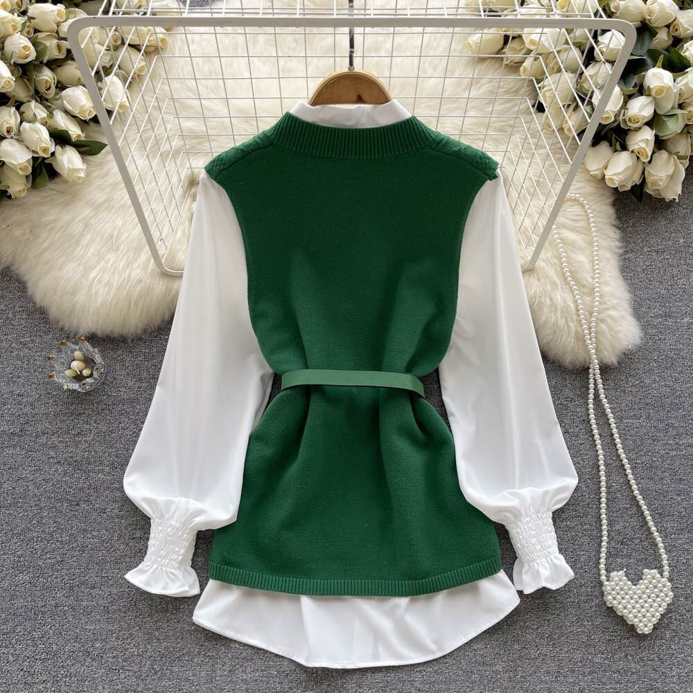 日本のカレッジ スタイル ツーピース スーツ グリーン ノースリーブ ニット ベスト ベスト ホワイト長袖シャツ トップ秋の女性 ロング オータム 秋物 lyxaj93445656940