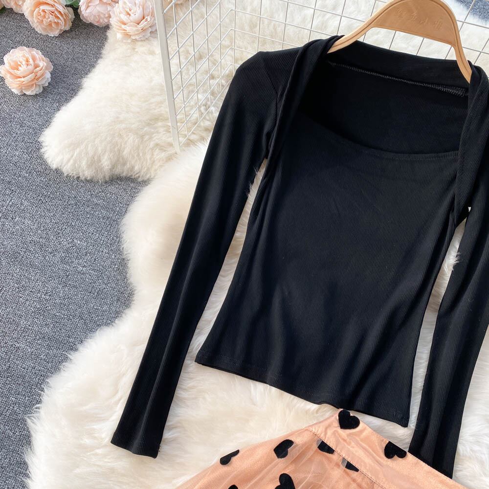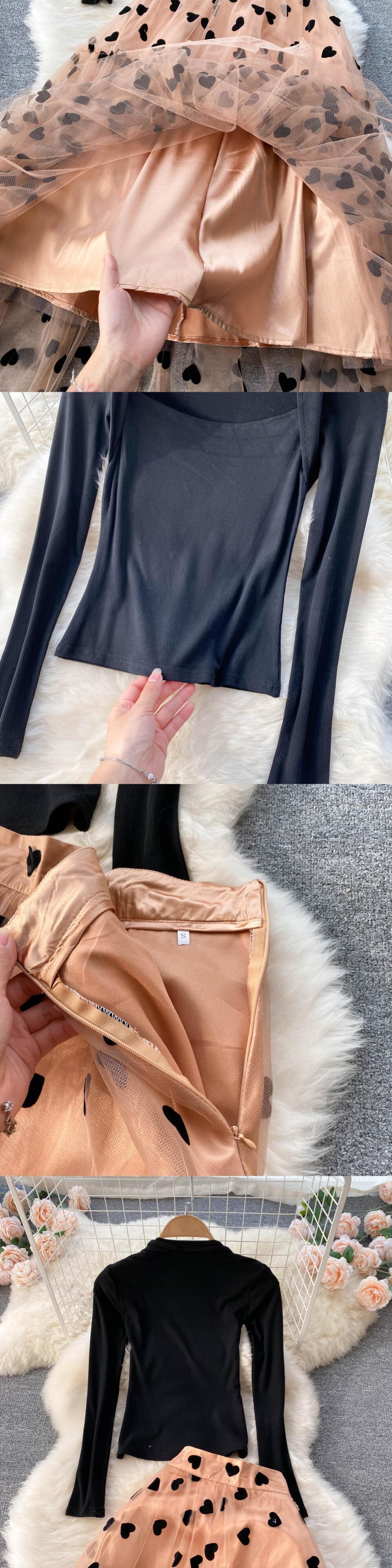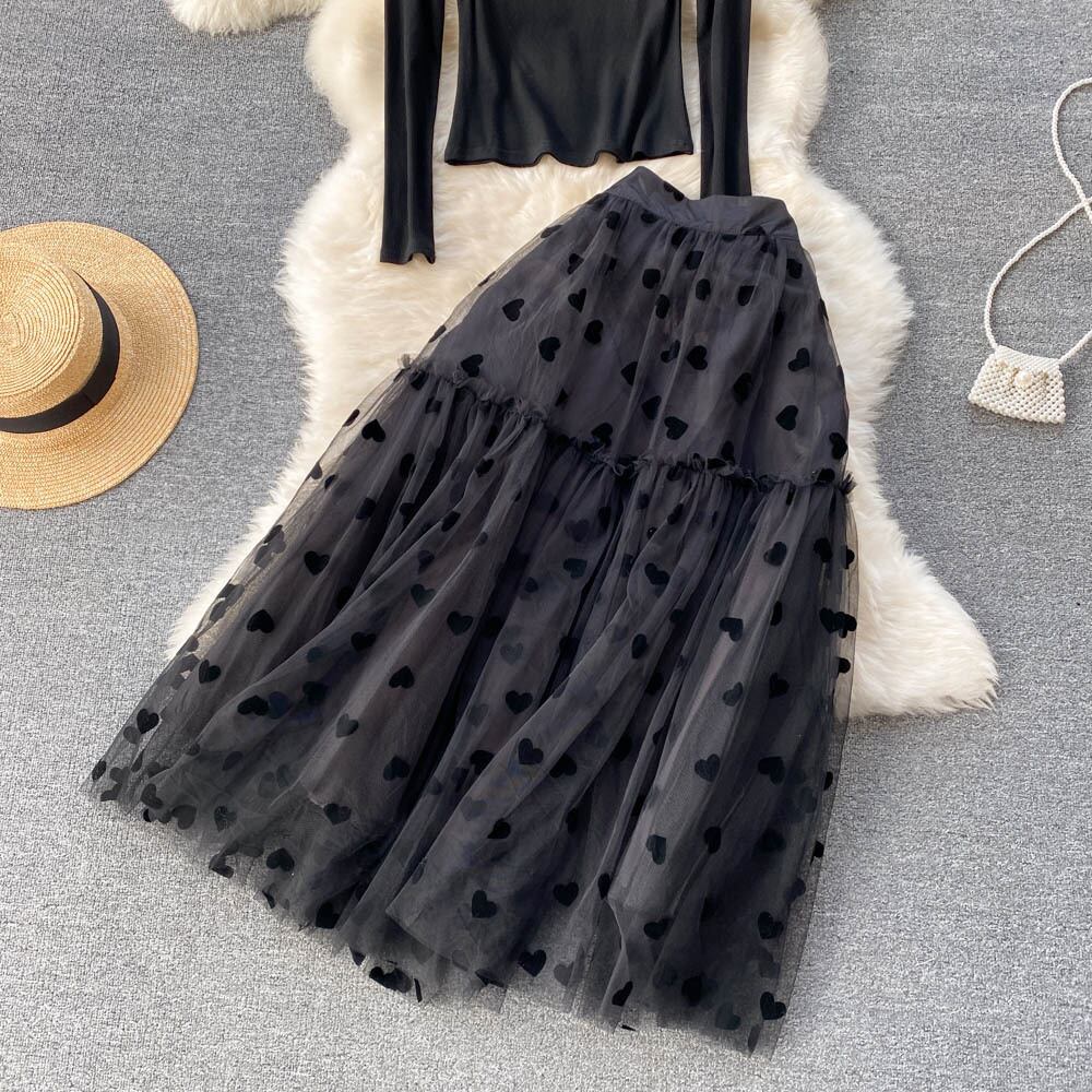 ヨーロッパ駅 2022 新レトロフレンチホルターネックスリム長袖 Tシャツ + メッシュ大スイングスカート揚げストリートツーピース女性 ロング ヨーロピアン lyxaj99131535650