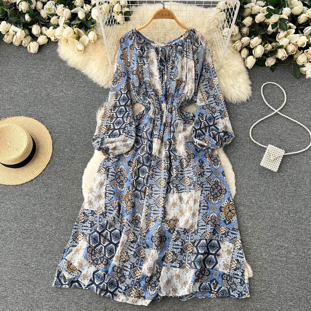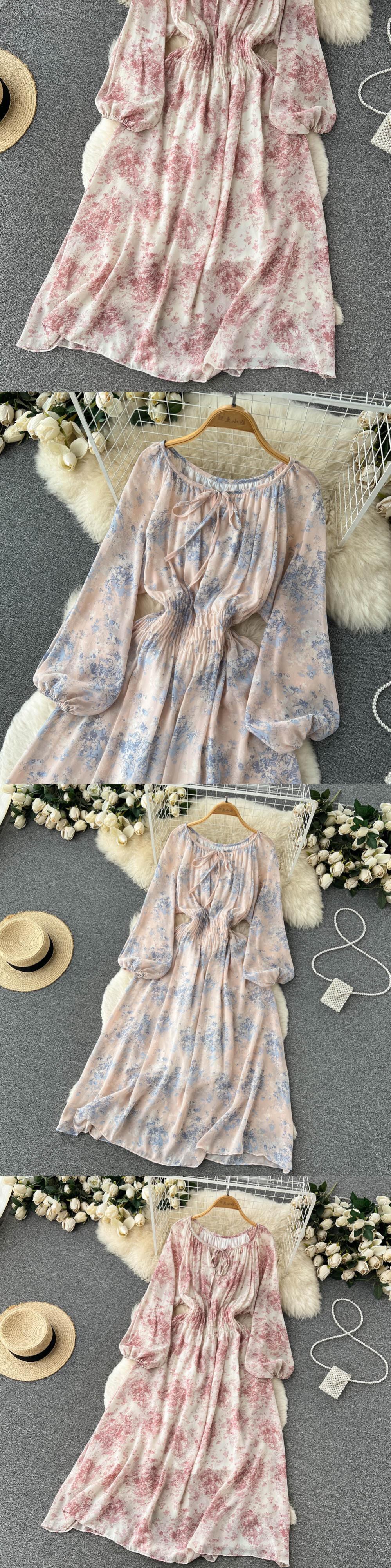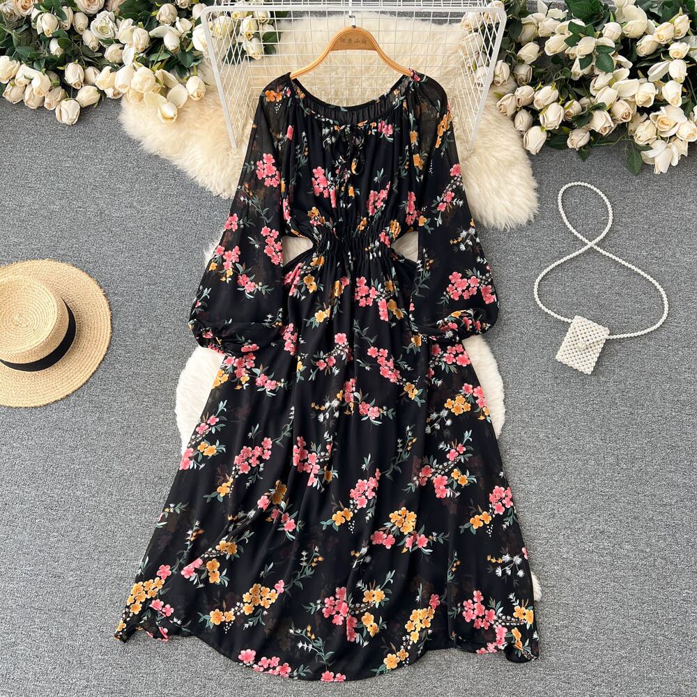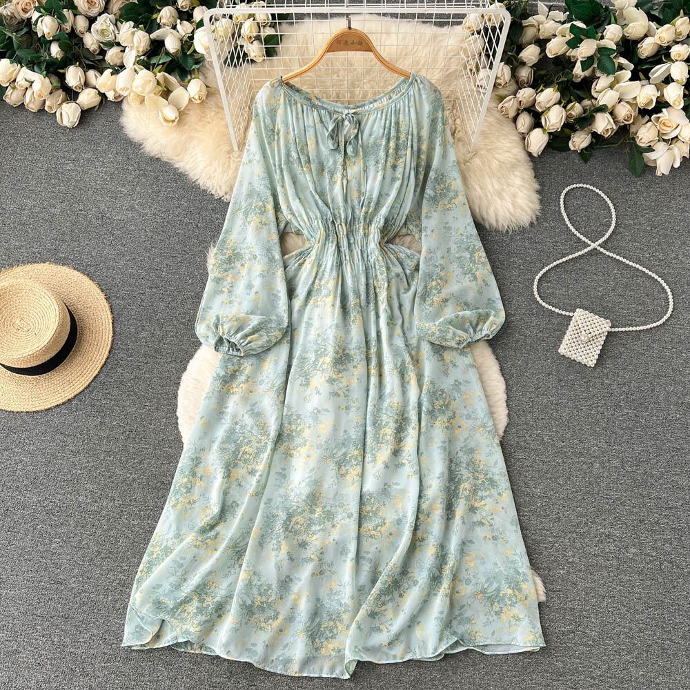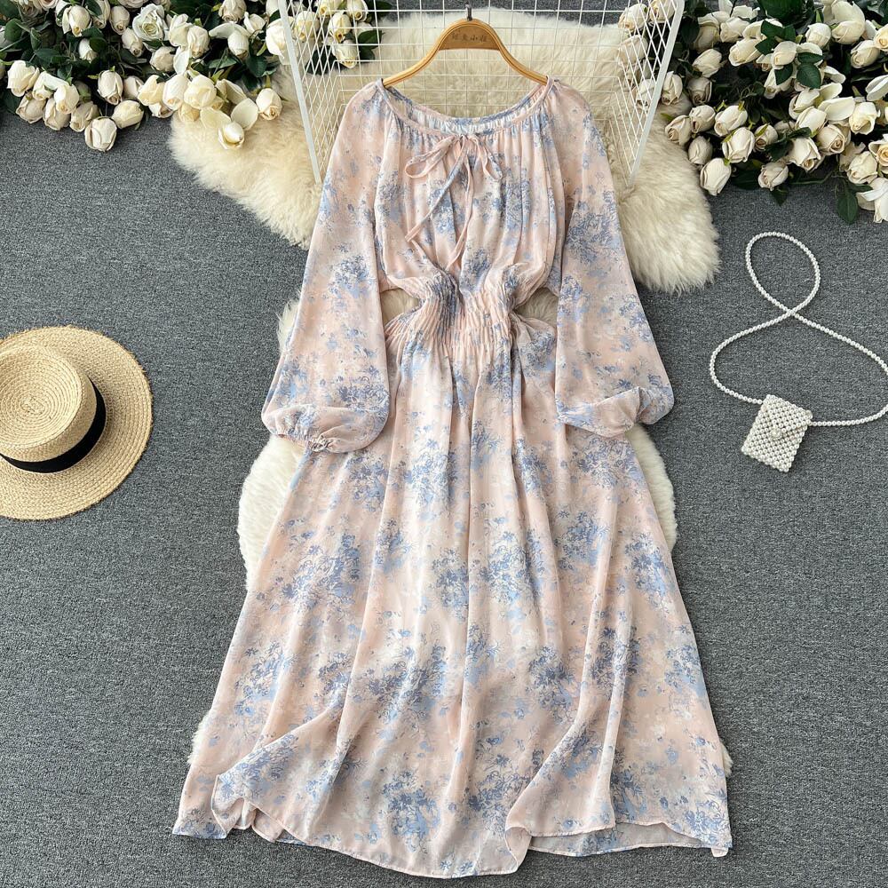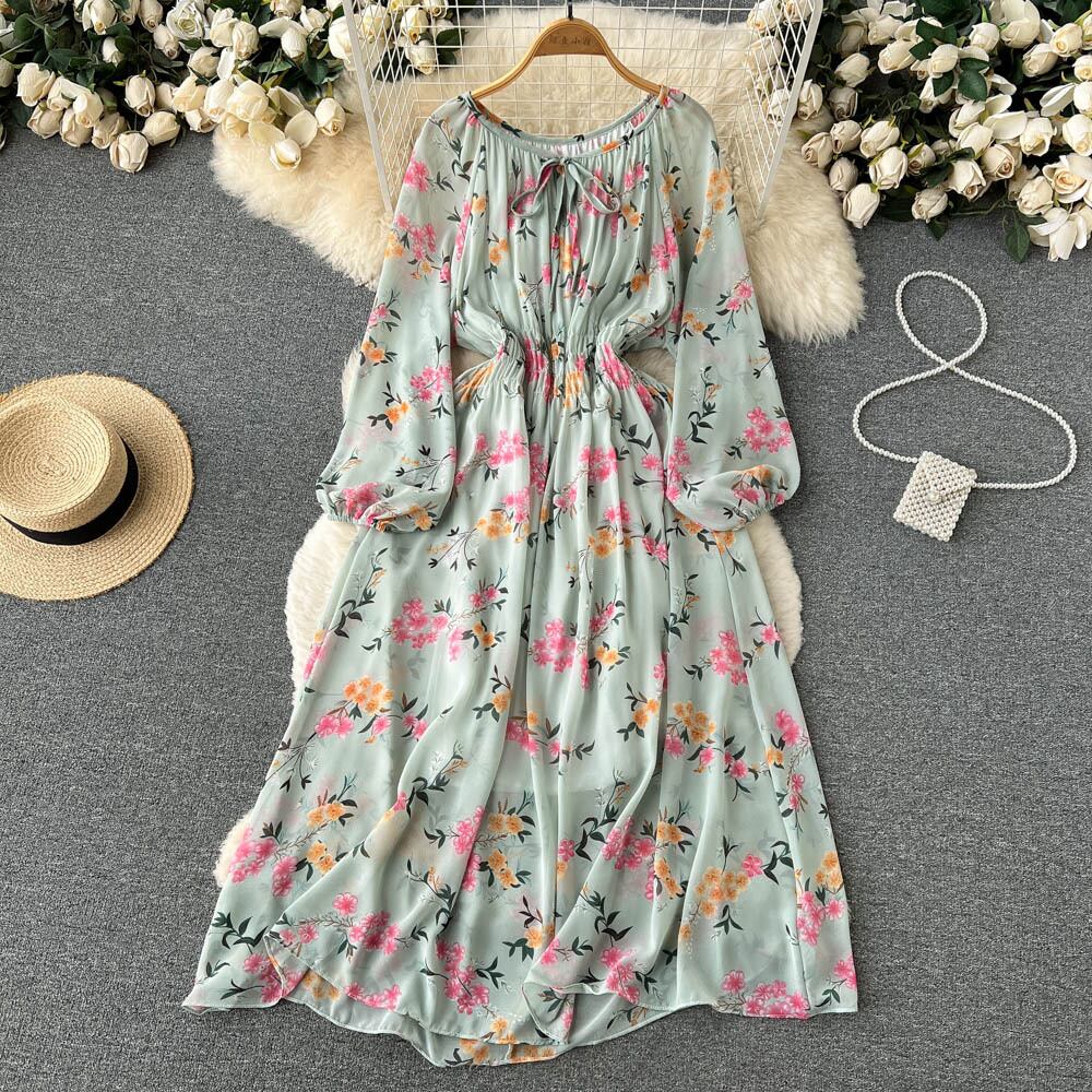 小さくシックで美しい長袖ドレス夏の女性のフランスの穏やかな風ウエスト花柄ティー ブレーク ドレス ロング サマー 夏物 lyxaj92509608011