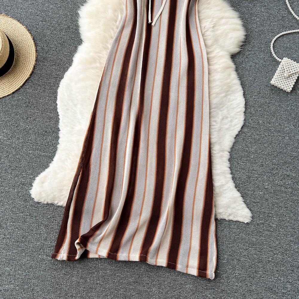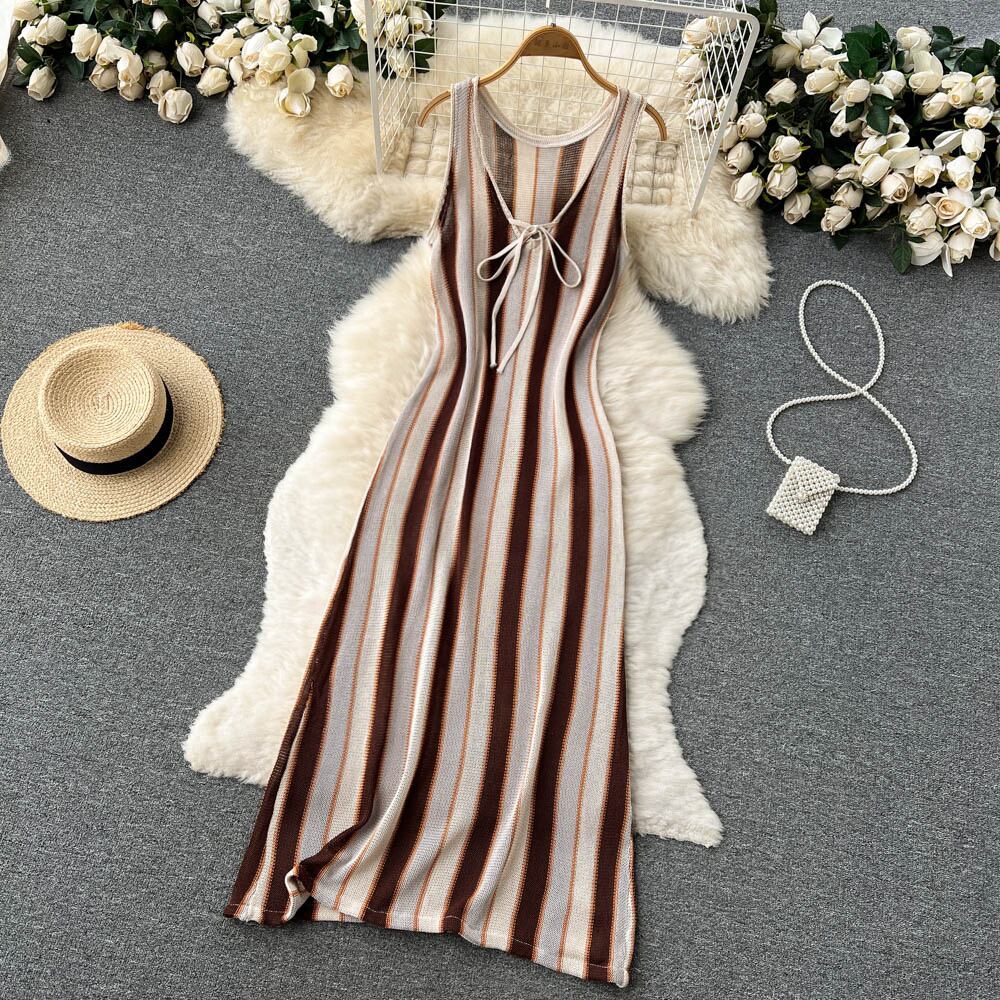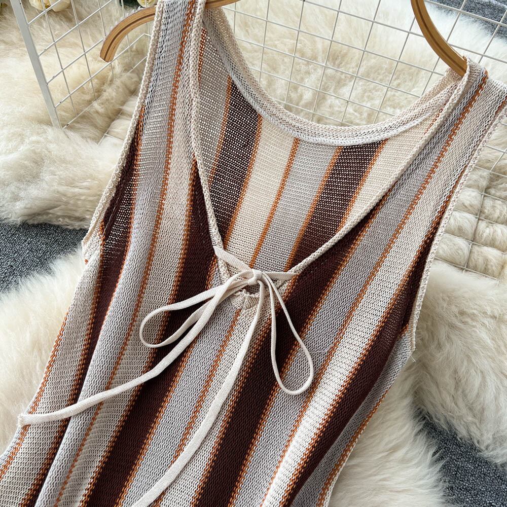 ヨーロッパとアメリカのスタイルウエスト痩身コントラストストライプレースノースリーブベストドレス夏の女性のニットロングスカートトレンド サマー 夏物 ヨーロピアン lyxaj8138613165