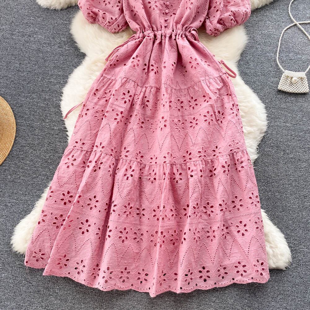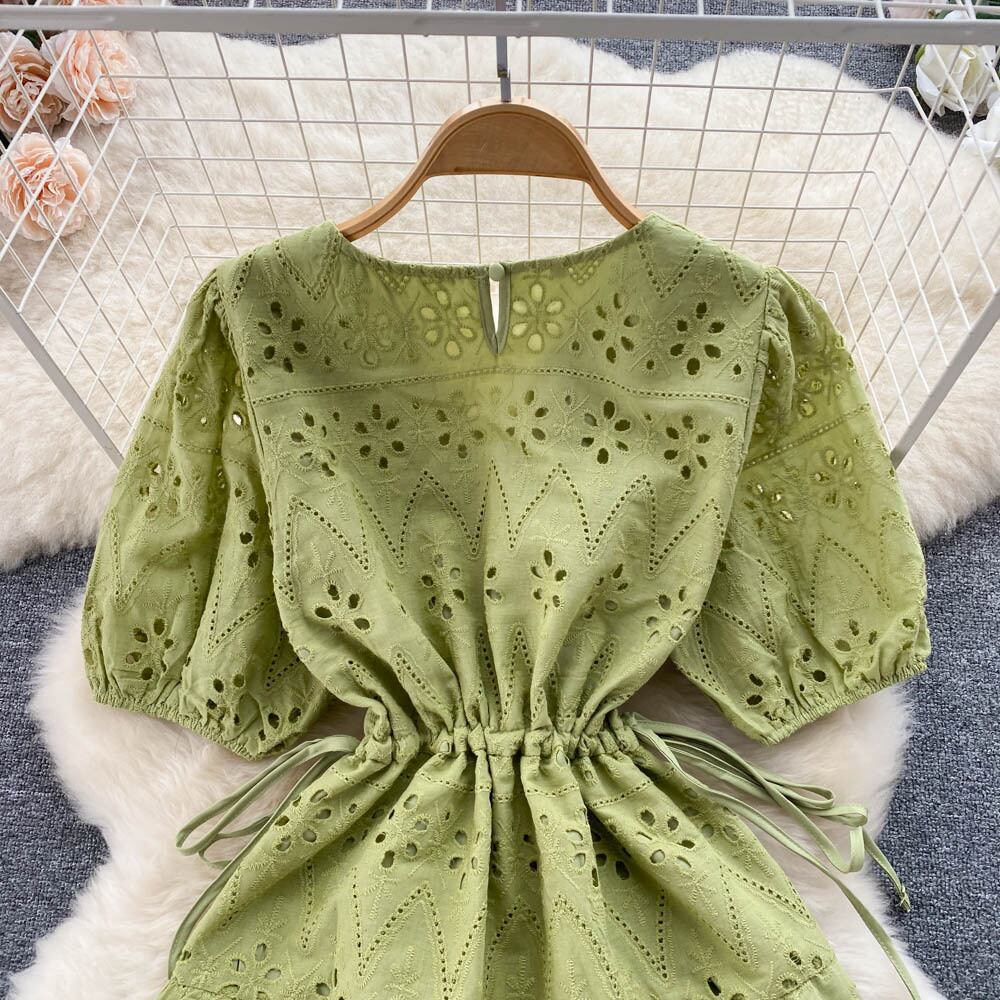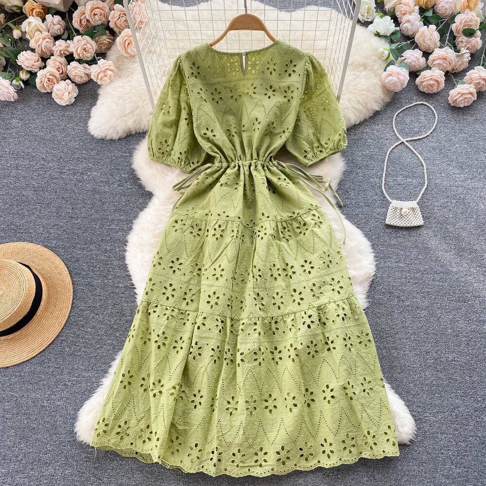 冷風中空パフスリーブドレス夏の女性の怠惰な風ドローストリングウエスト気質 V ネックロングスカートトレンド サマー 夏物 Vネック lyxaj75986839582
