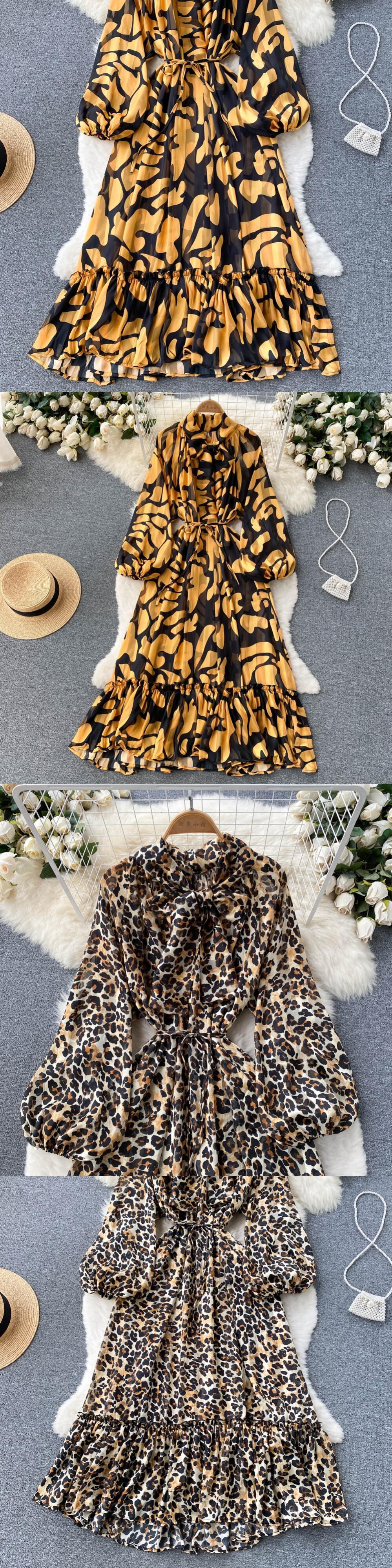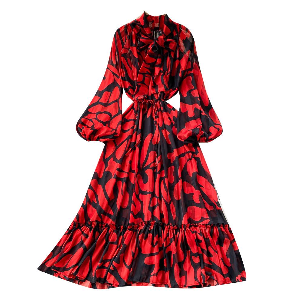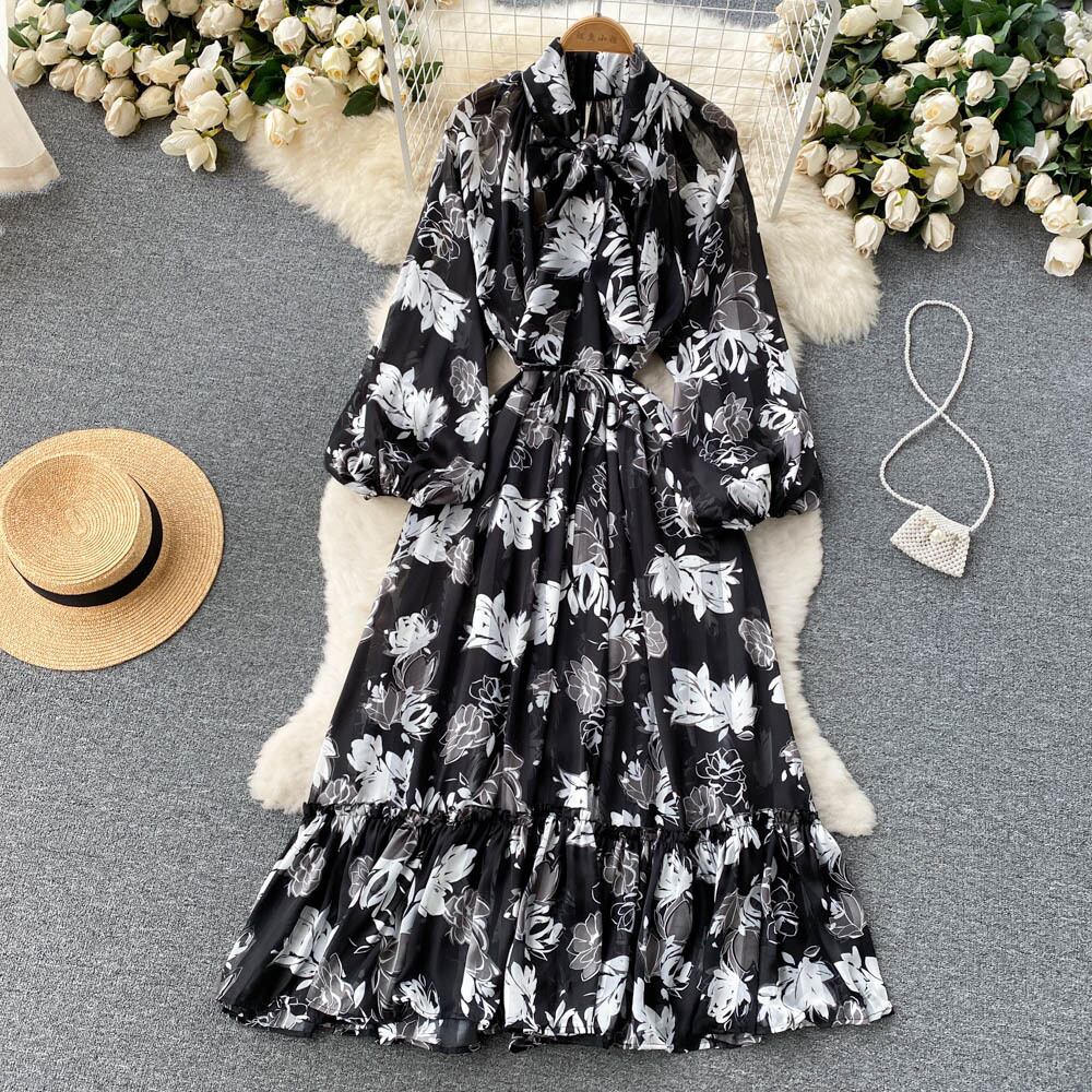 ヨーロピアンスタイルとアメリカンスタイルのフレンチレトロプリントボヘミアンロングスカートと大きなスイングフリルプリーツルーズランタンスリーブドレス lyxaj66309750231