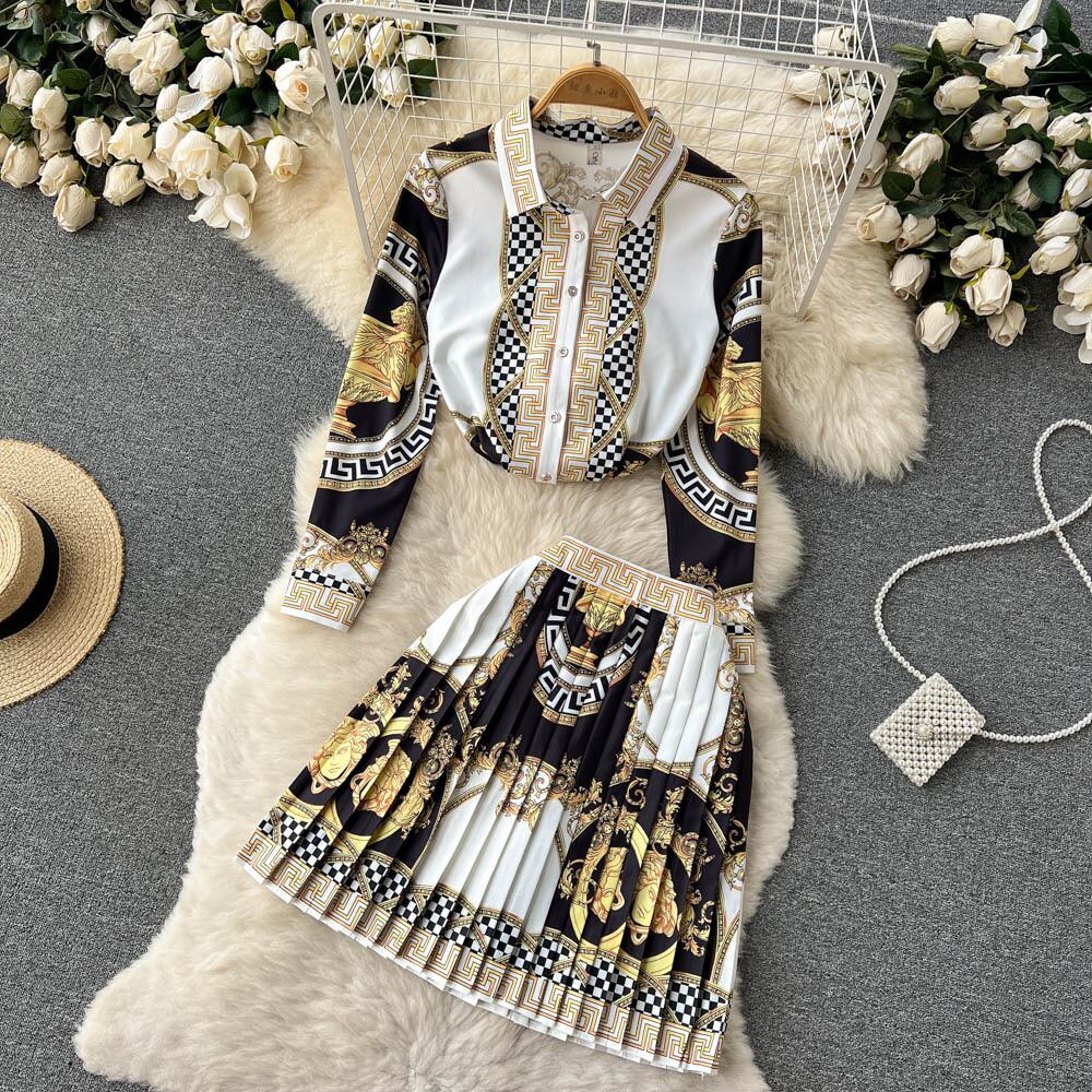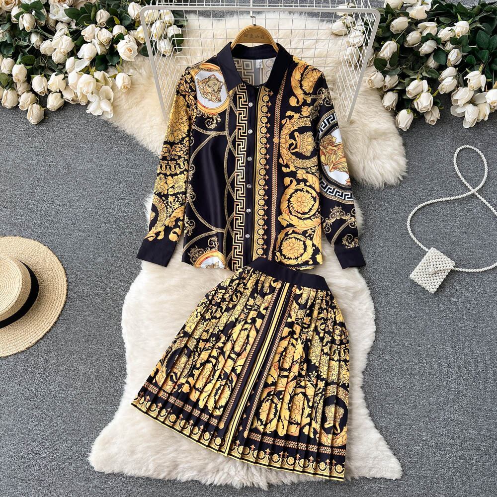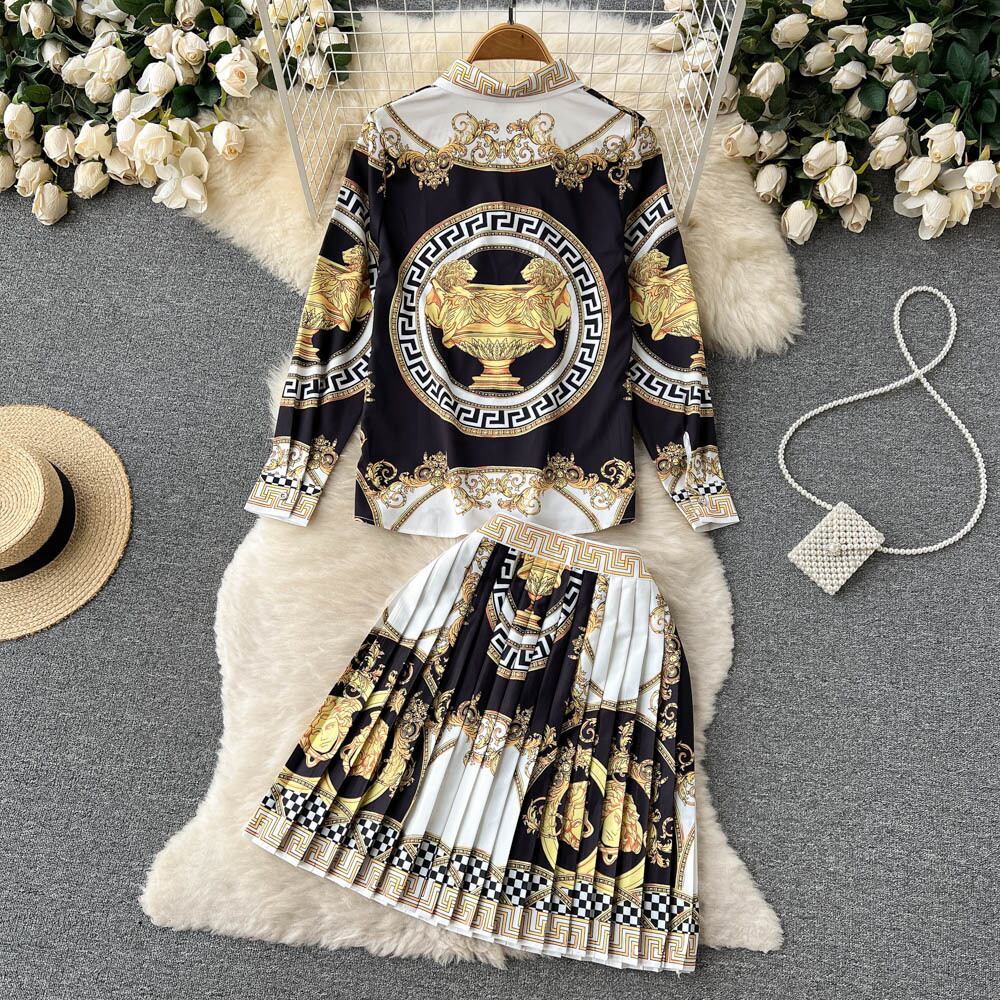 宮殿風レトロプリントスーツレディース春秋新作ゆったり長袖シャツハイウエストプリーツスカート2点セット ハイウェスト ロング レース スプリング 春物 オータム 秋物 lyxaj52406679387