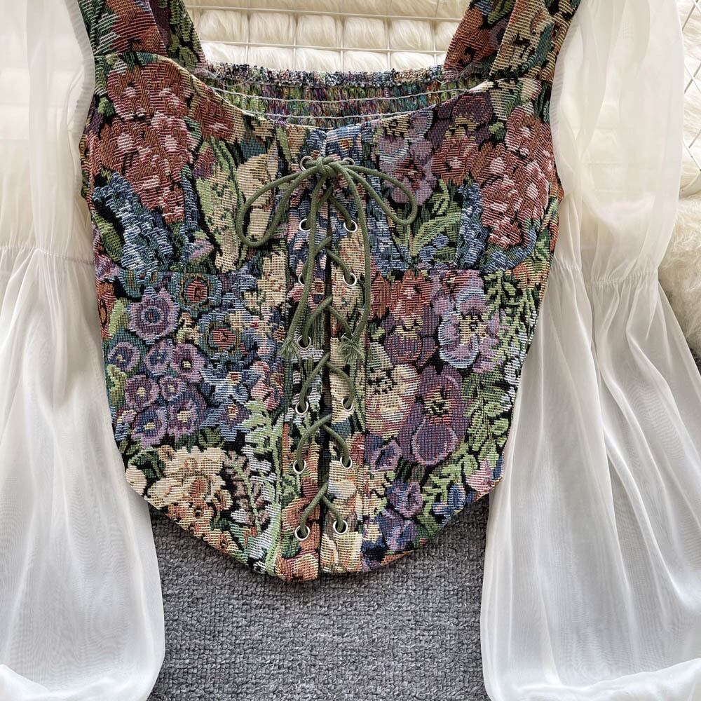 純粋な欲望のバージョン風油絵デザインセンスプリントメッシュレースステッチパフスリーブシャツショートトップタイド ピュア lyxaj63130028295