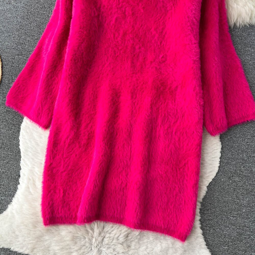 ネット赤秋と冬の新しいモヘア緩い V ネック怠惰な風ミッドレングス レトロ ニット セーター ドレス女性 レッド オータム 秋物 ウィンター 冬物 Vネック lyxaj71496345722