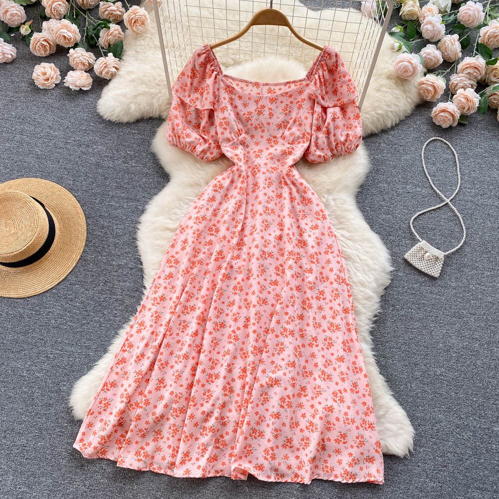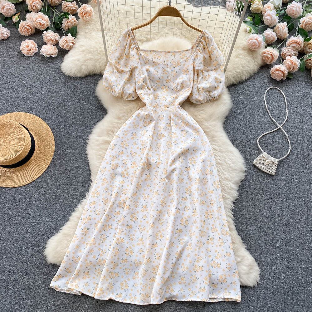 ese小さな新鮮な花柄スクエアカラードレス女性2022夏ウエスト痩身パフスリーブ年齢を減らすaラインスカート サマー 夏物 スクウェア lyxaj62023155436