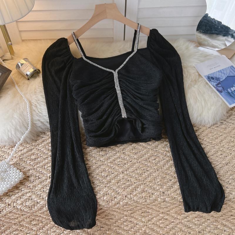 有名人の気質のニッチなデザイン ビーズ ストラップレス ランタン スリーブ シャツ トップ秋の女性のフレンチ ショート プリーツ トップ ランタンスリーブ オータム 秋物 lyxaj23086575380