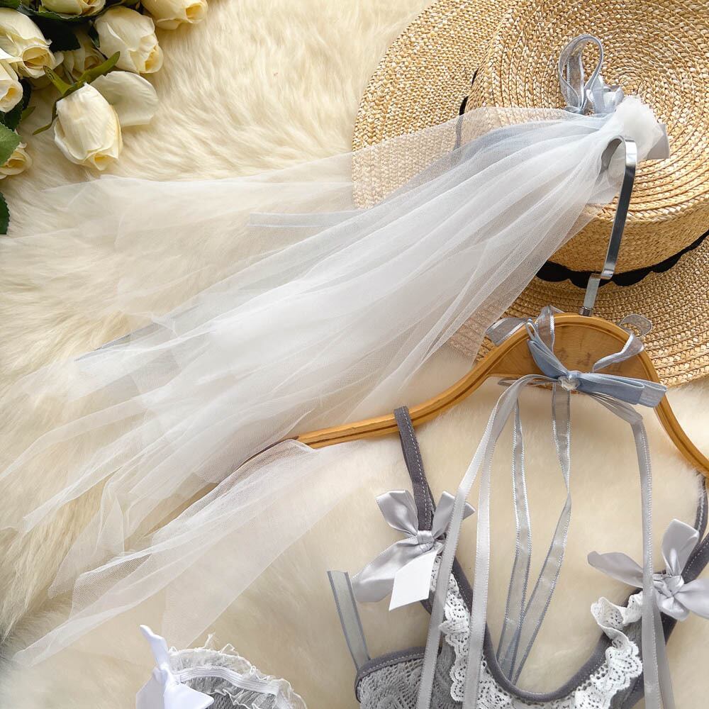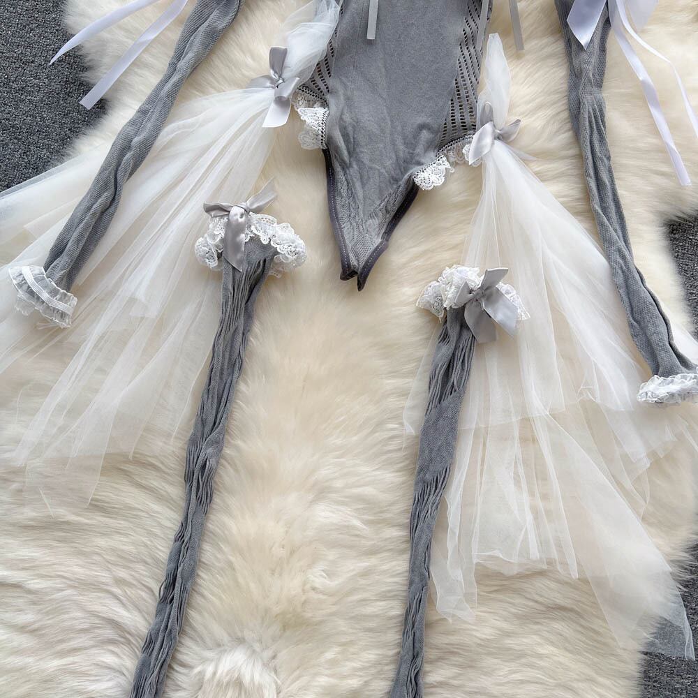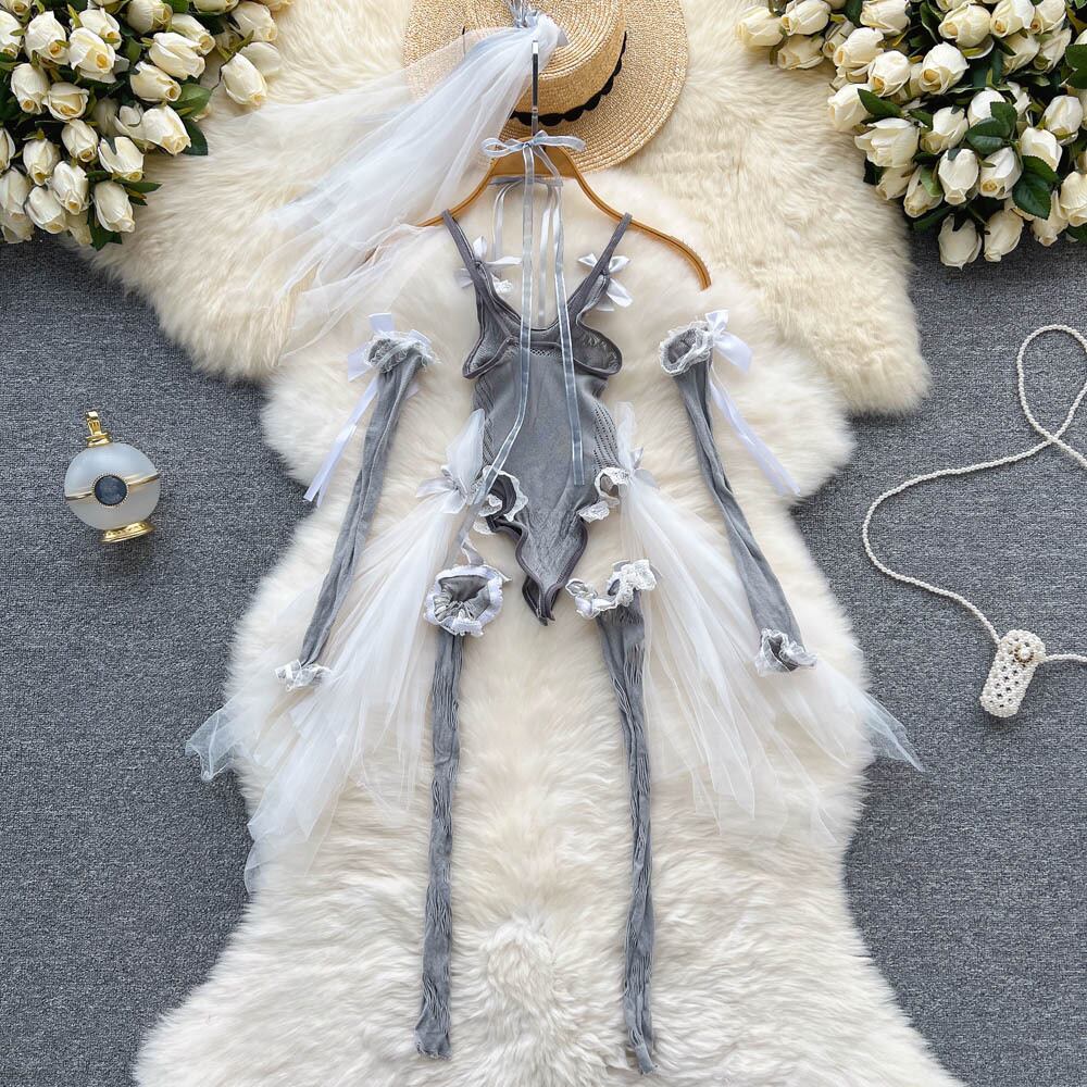 純粋な欲望スタイル メッシュ ステッチ弓気質ぶら下げネック ジャンプ スーツ女性夏袖セクシー ベール スーツ リボン サマー 夏物 ベィル ヘアアクセサリー lyxaj5349851209