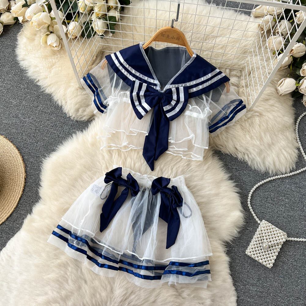 ese ソフト ファッション スーツ レディース 紺 衿 網紗 ショートトップ ふんわりスカート 小さめ 2点セット ふわふわ lyxaj45724529877