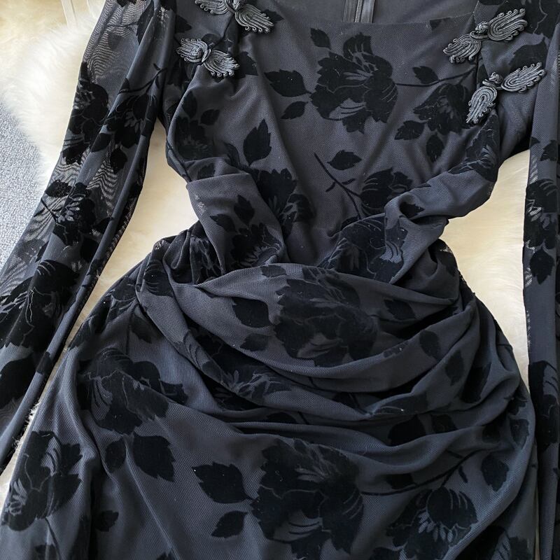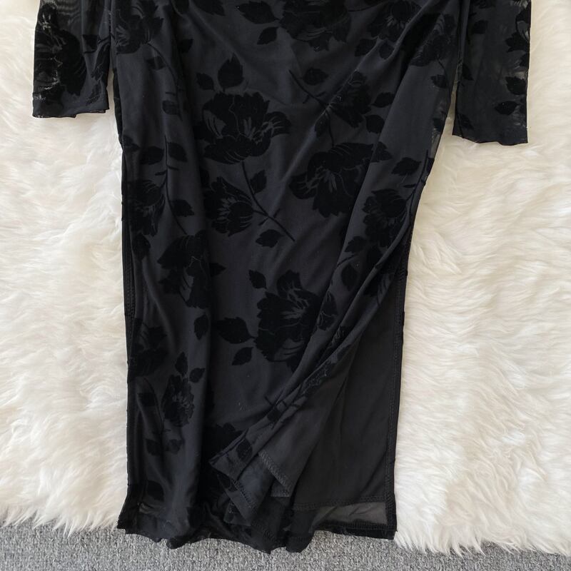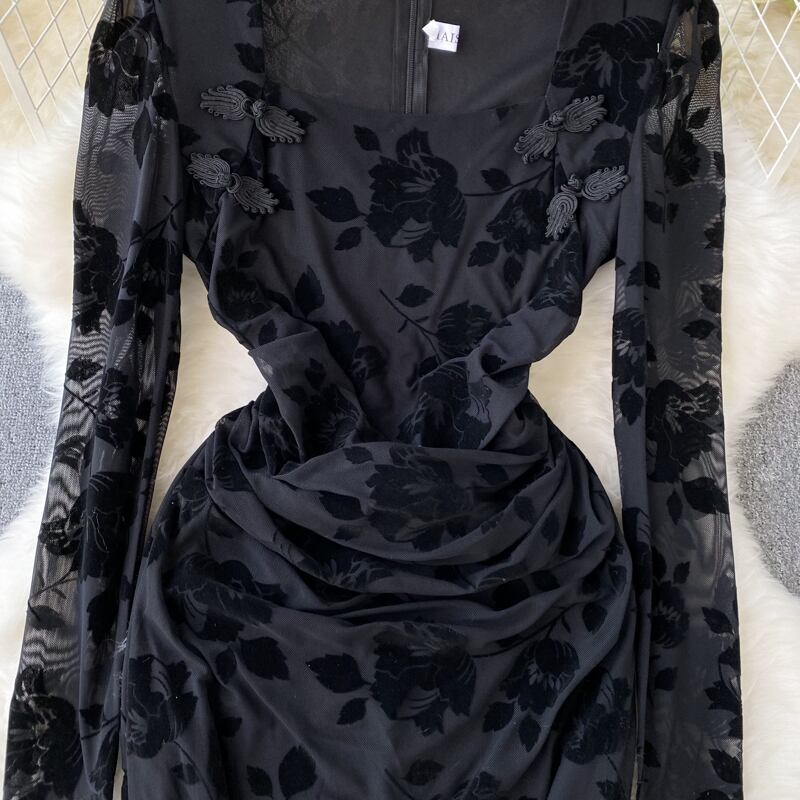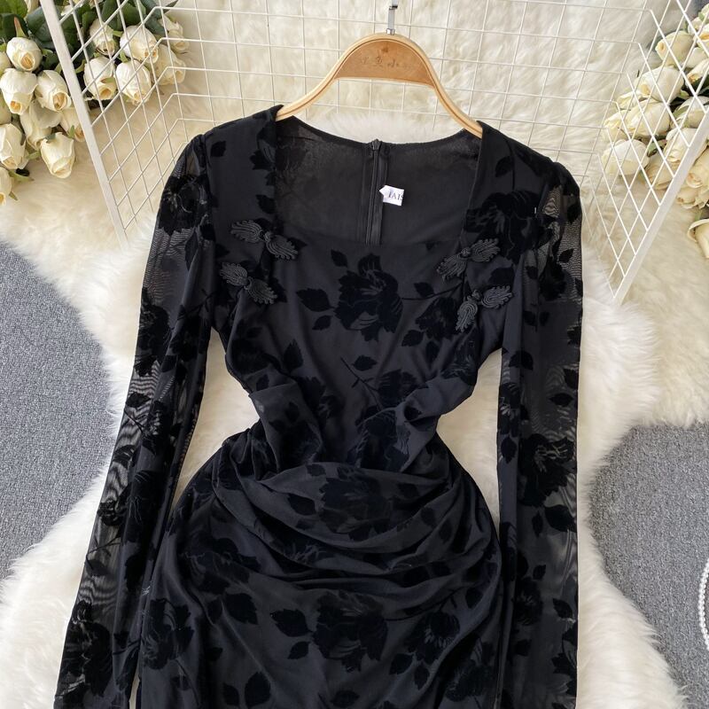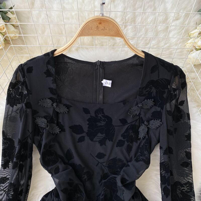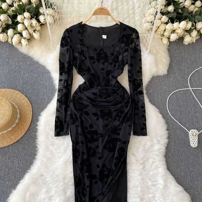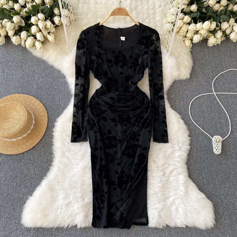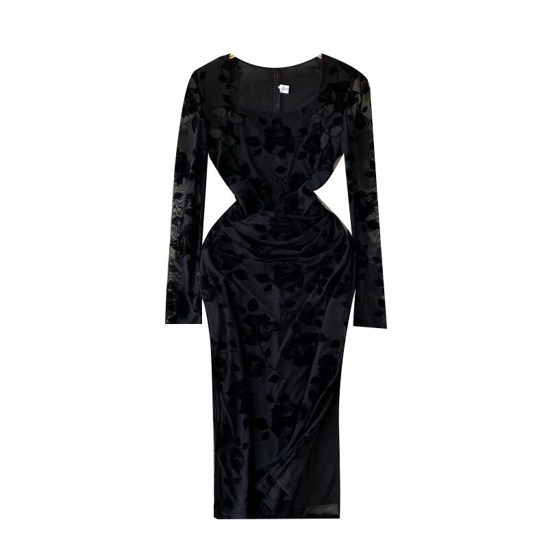 2022 秋冬フレンチスクエアカラーエンボス加工レディースハイウエストベルベット長袖黒スリットバッグヒップセクシーなドレス ハイウェスト ロング ブラック オータム 秋物 ウィンター 冬物 スクウェア lyxaj81674128308
