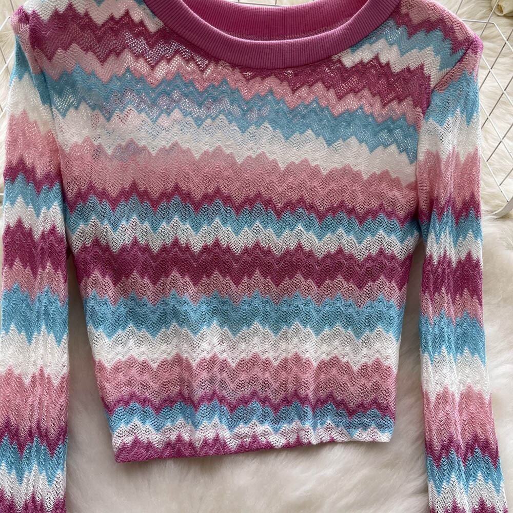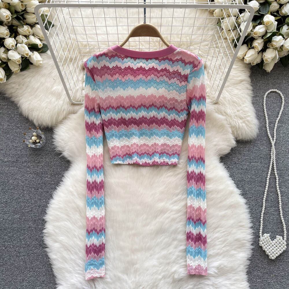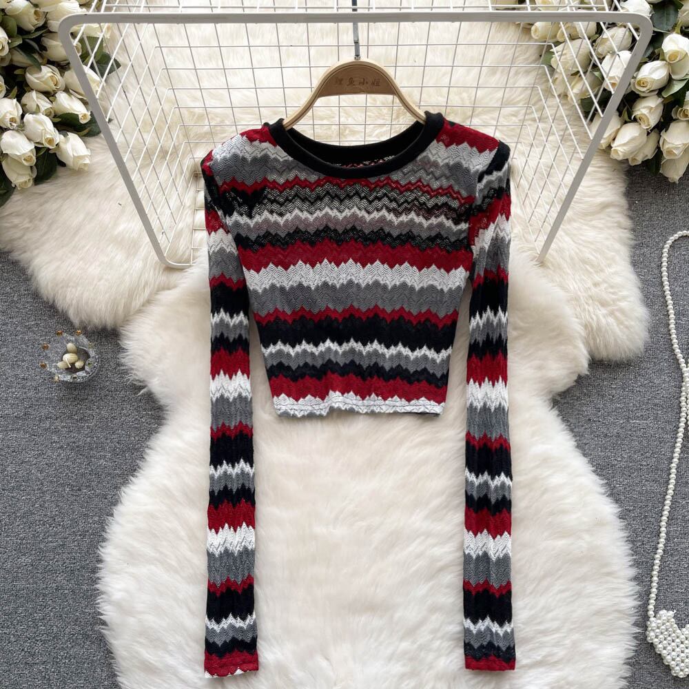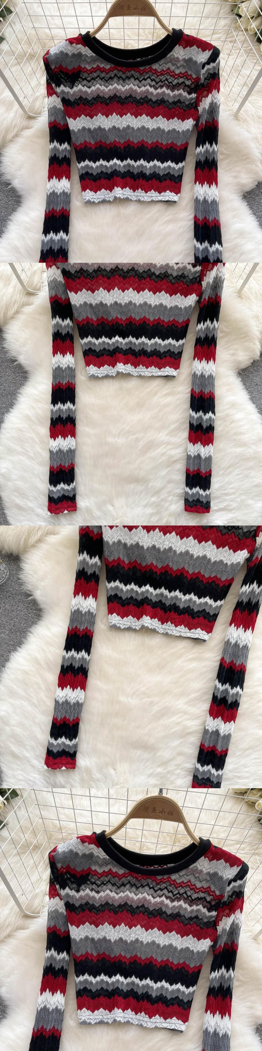 スパイスストライプの上質な長袖ニットセーターレディースインスタイル秋冬新デザインセンスニッチショートボトムスシャツ ロング オータム 秋物 ウィンター 冬物 lyxaj55837109347