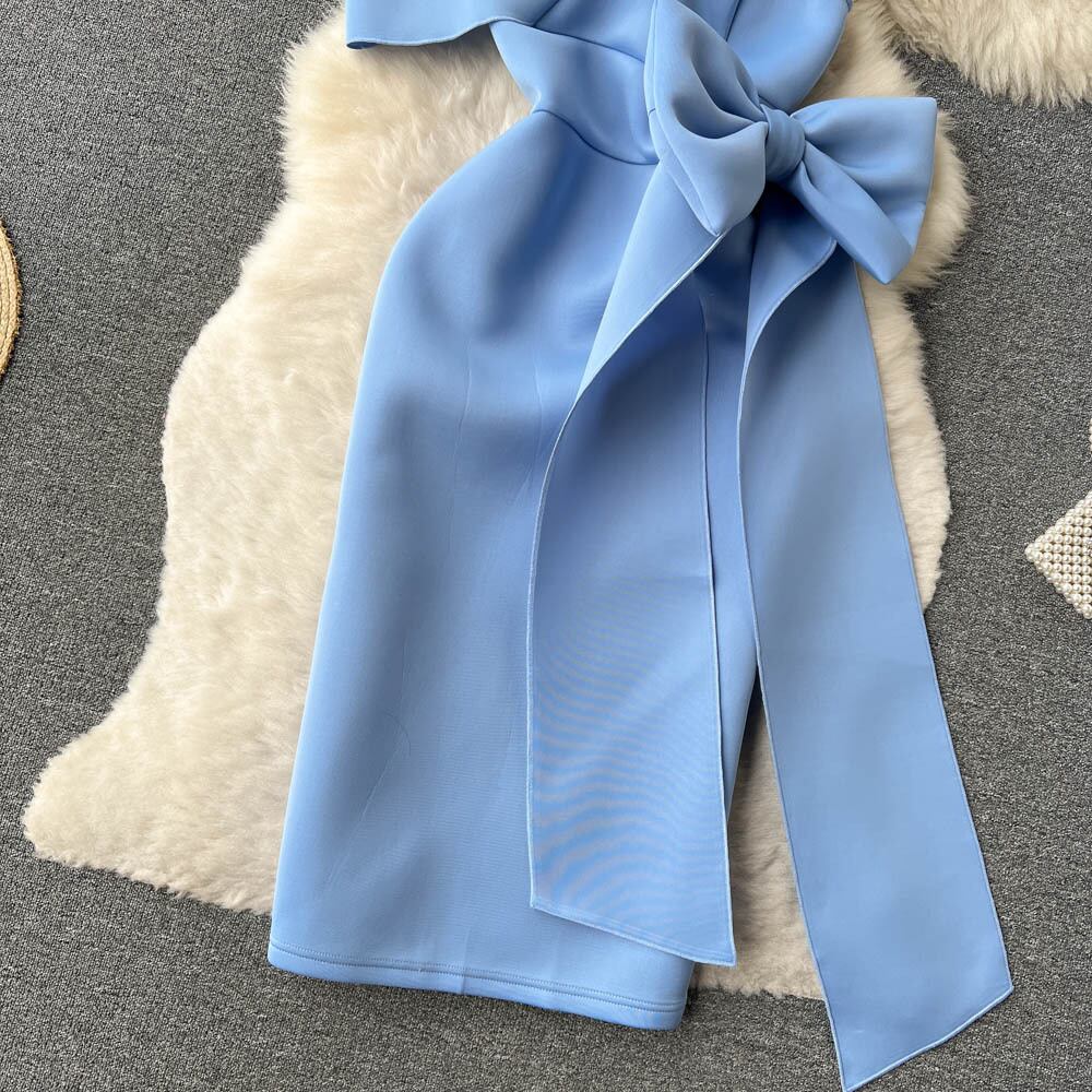 春夏セレブ風蝶ネクタイデザインセンスワンショルダー斜め襟気質ウエストバッグヒップイブニングドレスドレス リボン スプリング 春物 サマー 夏物 lyxaj25315050104