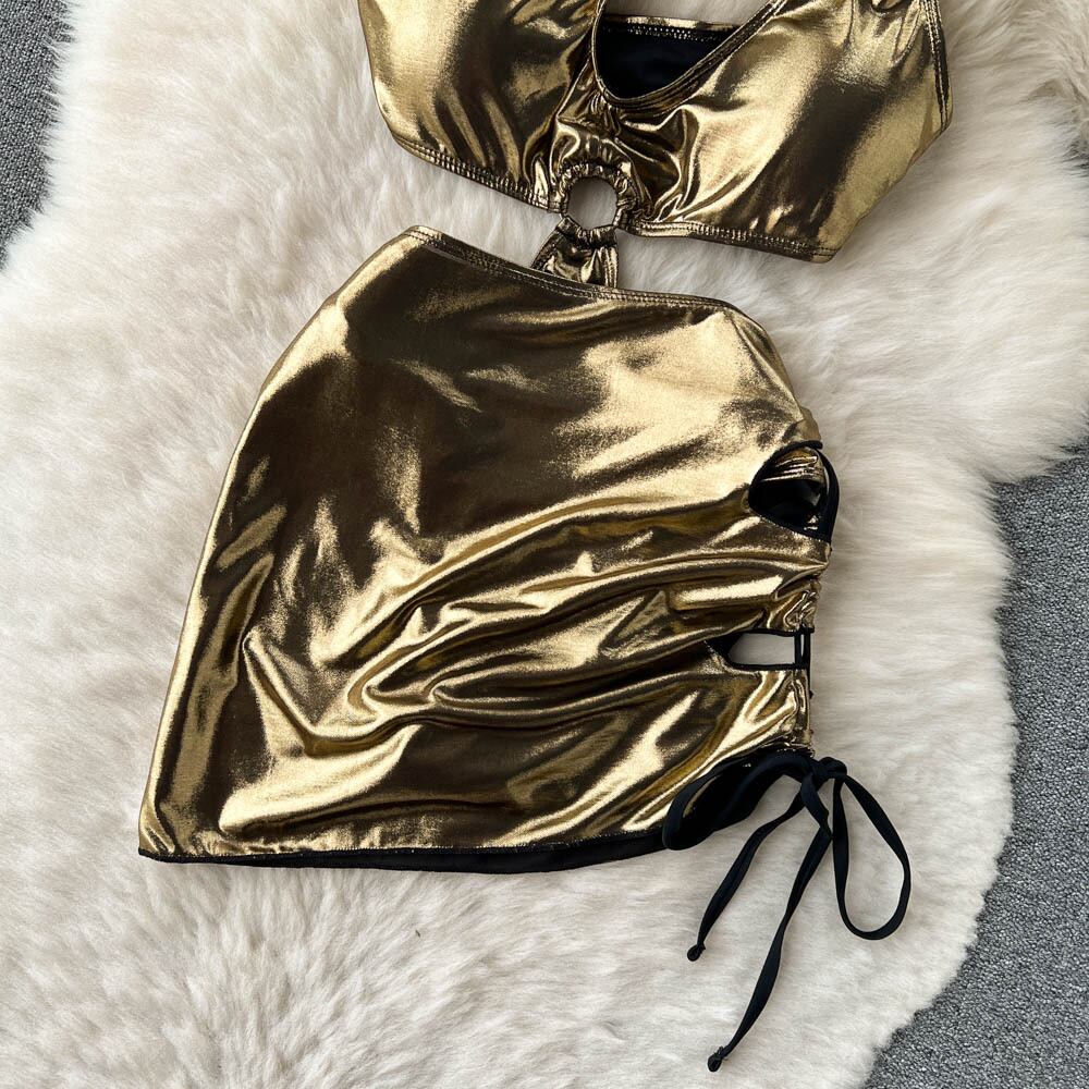 夏のセクシーなワンショルダーホローハンギングネックhigh-kサスペンダージャンプスーツ+ヒップスカートサテンツーピーストレンディ サマー 夏物 lyxaj96743543328