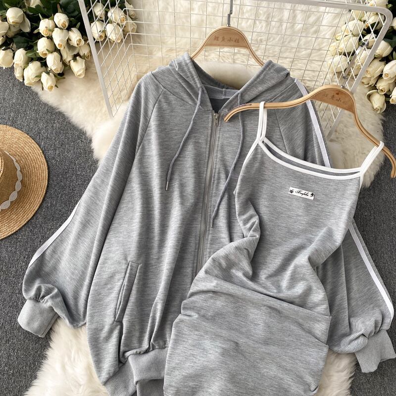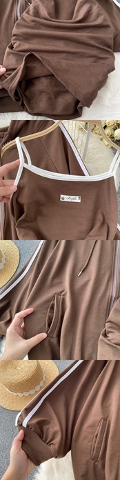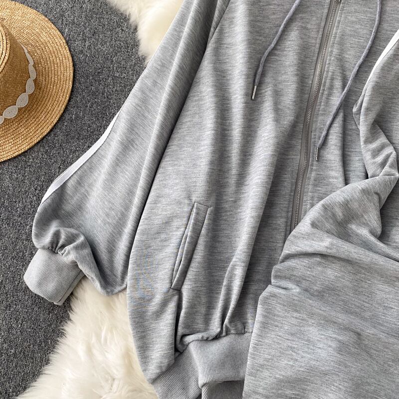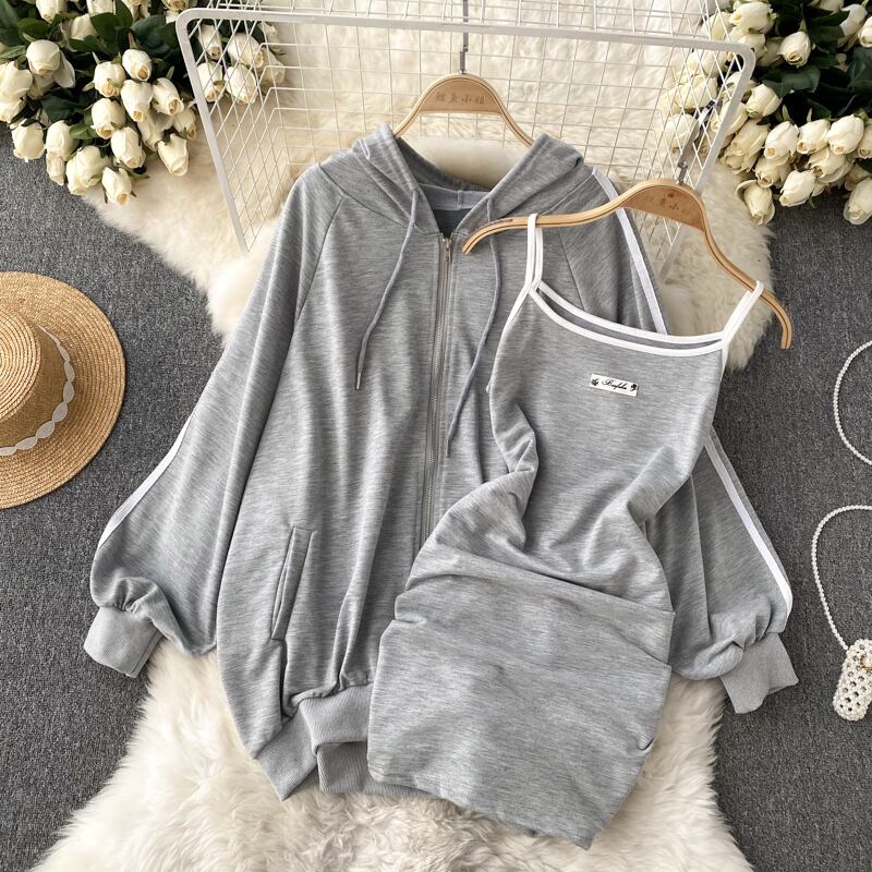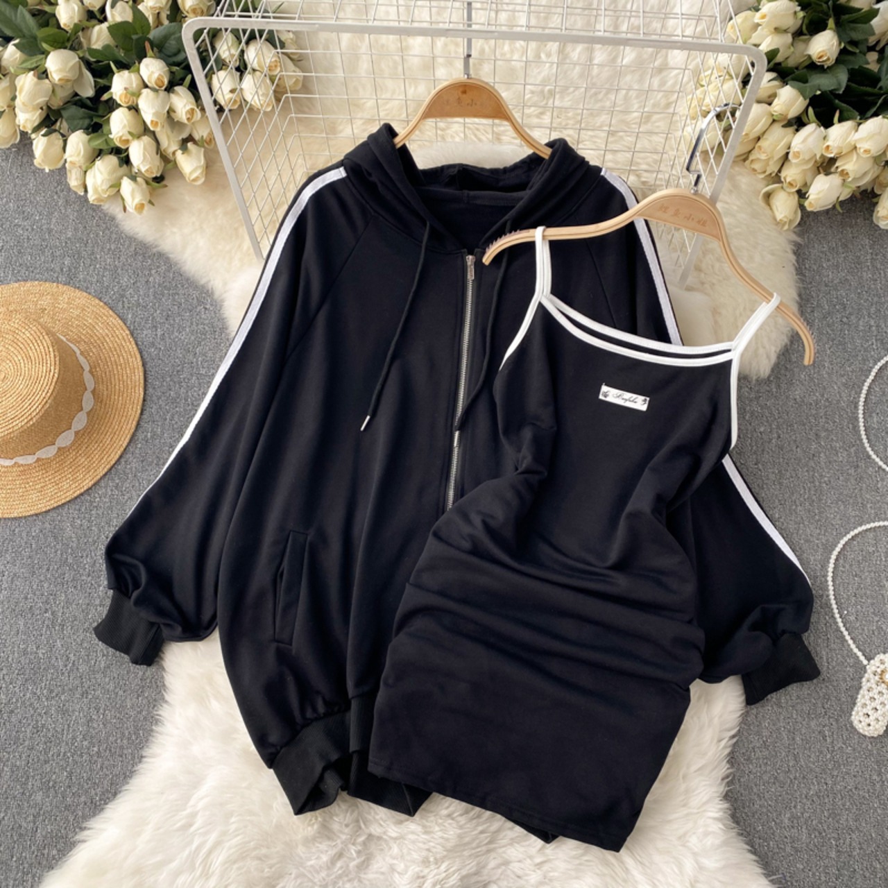 春と秋のカジュアルなスポーツ スーツ女性の色のコントラスト ストライプ フード付きジャケット + ヒップ ストラップ ドレス ツー ピース トレンディ スプリング 春物 オータム 秋物 lyxaj8034423971